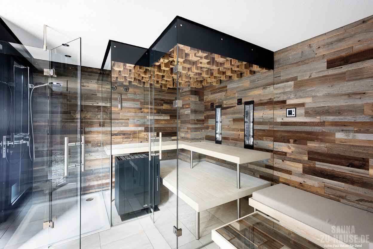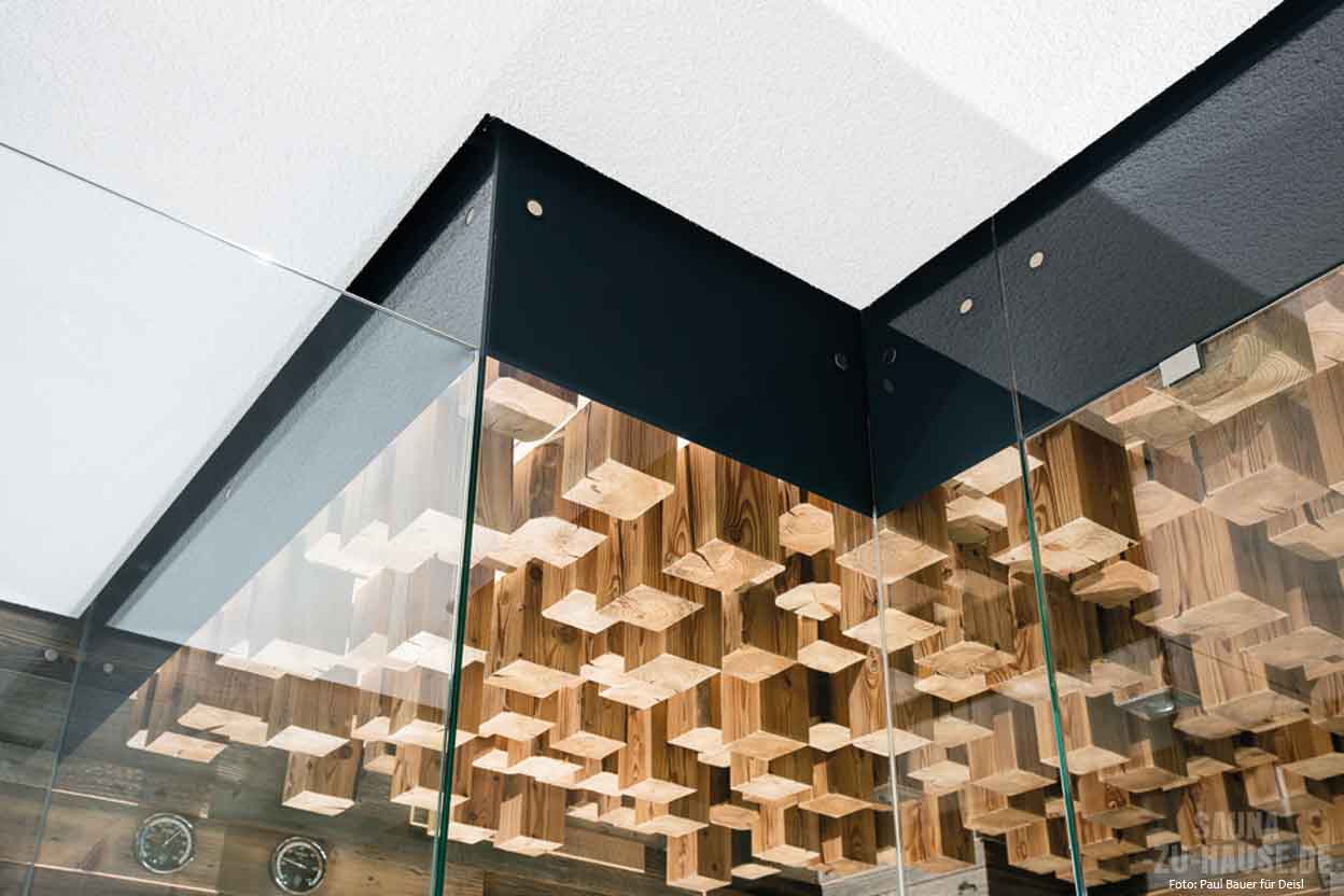 Besonders hervorzuheben ist die Materialkomposition der Kabine. Das Expertenteam von Deisl aus Österreich kombinierte klares und schwarz emailliertes Glas mit sonnenverbranntem Altholz und hellem Espenholz bei den Bänken. Die dreidimensionale Decke der Sauna setzt sich aus stürzenden Holzblöcken zusammen, was einen optisch dynamischen Kontrast zur ansonsten klaren Gestaltung darstellt. Anstatt die einzelnen Bereiche voneinander abzugrenzen, entschied sich der Saunaplaner Martin Lackner für ein harmonisches Gesamtkonzept, das den Duschraum nahtlos in die Sauna übergehen lässt. Highlight: Durch die offenen Glasfronten lässt sich das in der Kabine verdeckt verbaute LED-Farblicht auch als indirekte Beleuchtung für den gesamten Wellnessraum nutzen.