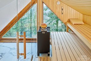 Das Klima im Schwarzwald kann zuweilen recht rau sein mit langen Wintern und ergiebigen Niederschlägen. Doch gerade bei schlechtem Wetter, wenn Sturm und Regen durch die Baumkronen peitschen, wird diese Dachgeschosssauna zu einem Refugium des Wohlbefindens. Dafür sorgt der Saunaofen „Herkules S25 Vapor black“ von EOS, der über einen zusätzlichen 2-kW-Verdampfer verfügt. Im Gegensatz zu den Vögeln im Nest kann die Familie damit von heiß und trocken bis mild und feucht zwischen unterschiedlichenKlimaformen wählen.