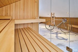 Das Holzhandwerk hat im Schwarzwald eine tief verwurzelte Tradition und kulturelle Bedeutung, die von den Saunaspezialisten aus Wildberg mit Leidenschaft gelebt wird. Passend zum Blick in den Wald schlugen sie für die Innenverschalung daher auch eine heimische Holzart vor: die Weißtanne. Sie ist die wichtigste natürliche Nadelbaumart im Schwarzwald und erzeugt ein helles, freundliches Raumgefühl, weshalb sie zu den beliebtesten Saunahölzern gehört. Die Bänke bestehen aus FSC-zertifiziertem Abachiholz, das sich durch seine angenehme Oberfläche und die geringe Wärmeleitung auszeichnet.