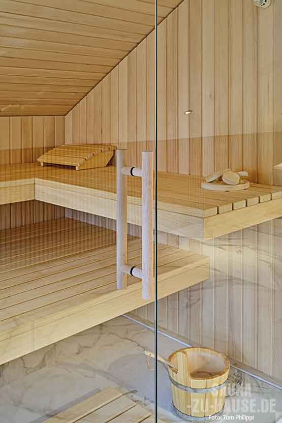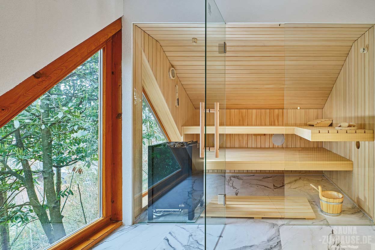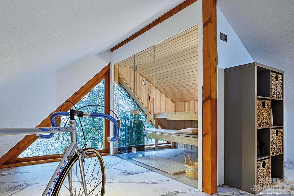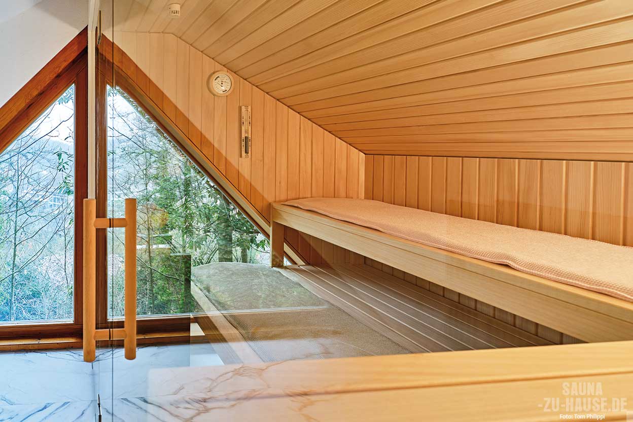 Ganz neue Perspektiven eröffnen sich beim Schwitzen in dieser maßgeschneiderten Dachgeschosssauna: Wie in einem Vogelnest können die Besitzer einen atemberaubenden Ausblick auf die umgebenden Baumwipfel genießen. Wenn dann noch wohlige Wärme den Körper umhüllt, aromatischer Holzgeruch in die Nase steigt und das einzige Geräusch das leise Knacken des Saunaofens ist, ist die Welt wieder in Ordnung.