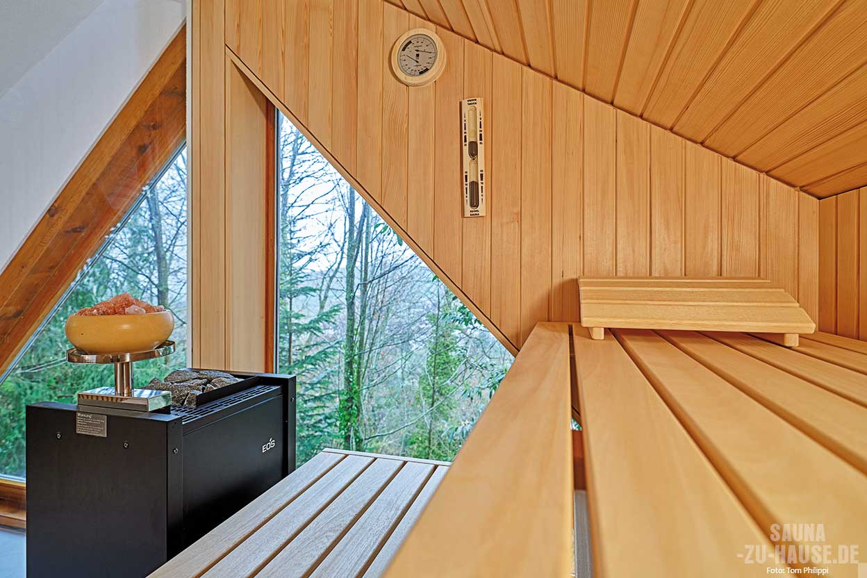 Das Klima im Schwarzwald kann zuweilen recht rau sein mit langen Wintern und ergiebigen Niederschlägen. Doch gerade bei schlechtem Wetter, wenn Sturm und Regen durch die Baumkronen peitschen, wird diese Dachgeschosssauna zu einem Refugium des Wohlbefindens. Dafür sorgt der Saunaofen „Herkules S25 Vapor black“ von EOS, der über einen zusätzlichen 2-kW-Verdampfer verfügt. Im Gegensatz zu den Vögeln im Nest kann die Familie damit von heiß und trocken bis mild und feucht zwischen unterschiedlichenKlimaformen wählen.