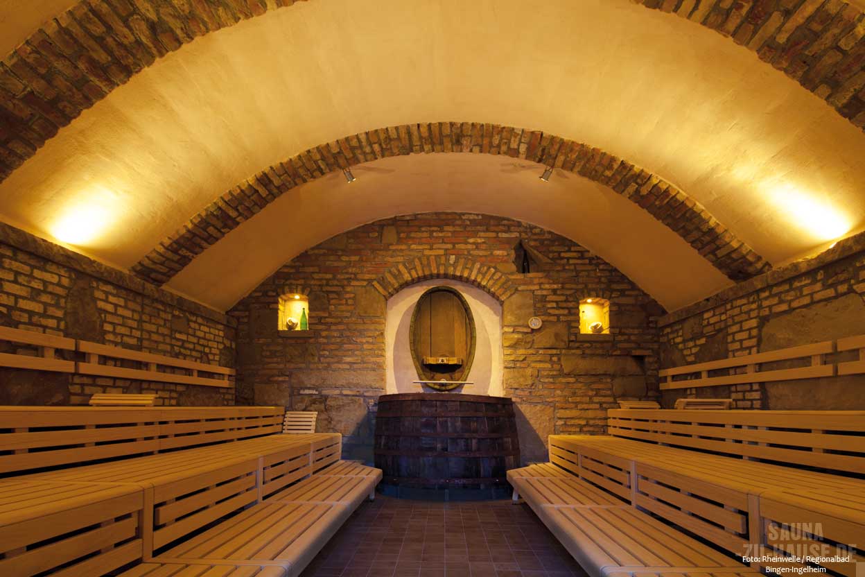 Die Weinkeller-Sauna in der „Rheinwelle-Saunawelt“ begeistert mit rheinhessischem Flair und liebevoll gestaltetem Design. Steinwände, Ziegelgewölbe und Aufgüsse aus dem Weinfass machen sie zu einem