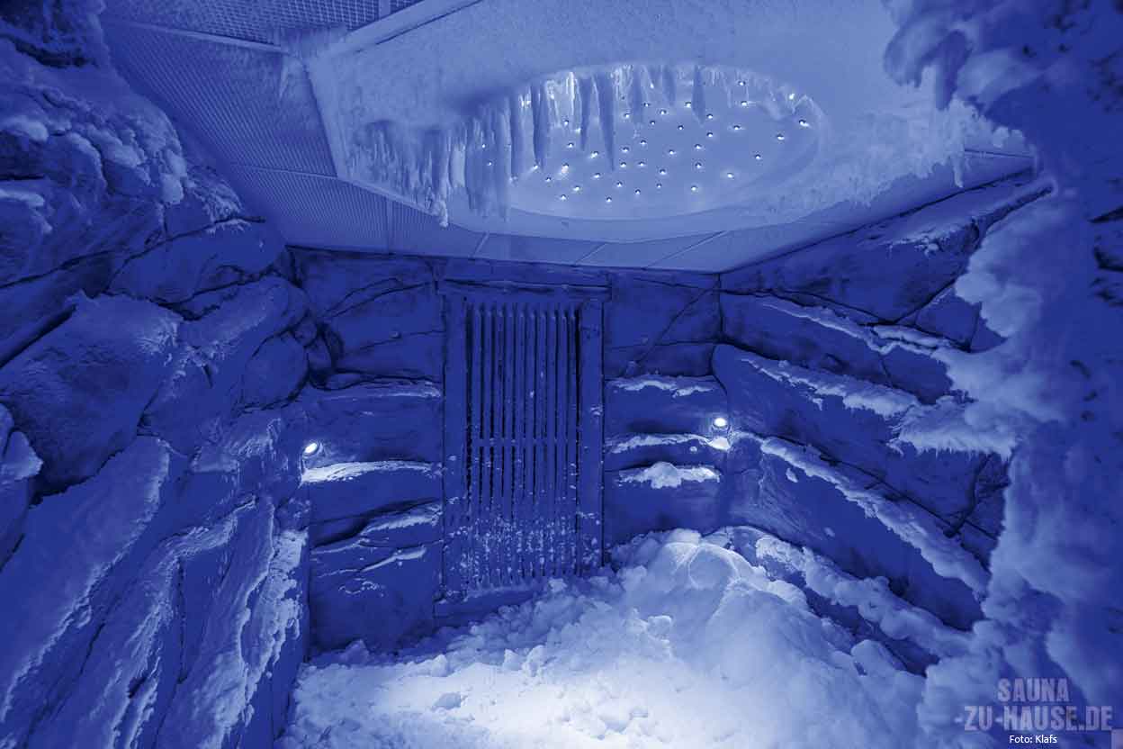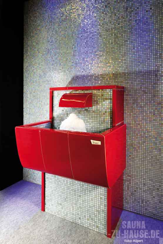 Die einfachste Möglichkeit, sich nach der Sauna richtig abzukühlen, ist das Einreiben mit Eis. Da jedoch der Gang zum Eisfach des Kühlschranks mehr als mühevoll und umständlich wäre, empfiehlt sich ein kompakter Eisbrunnen, der im Prinzip wie eine Eismaschine funktioniert. Die auf dem Markt angebotenen Modelle bieten für jeden Geschmack und für alle Bedürfnisse die richtige Lösung: ob frei stehend, mit Mosaiken versehen und in die Wand eingelassen, groß oder klein. Häufig sorgt hier eine ausgeklügelte Regeltechnik dafür, dass nur dann Eis produziert wird, wenn es auch benötigt wird. Wenn der Eisbrunnen, wie beispielsweise der „Polaris“ von Klafs, dann auch noch zuverlässig isoliert ist, verhindert man zudem wirkungsvoll unnötiges Wegschmelzen des Eises.