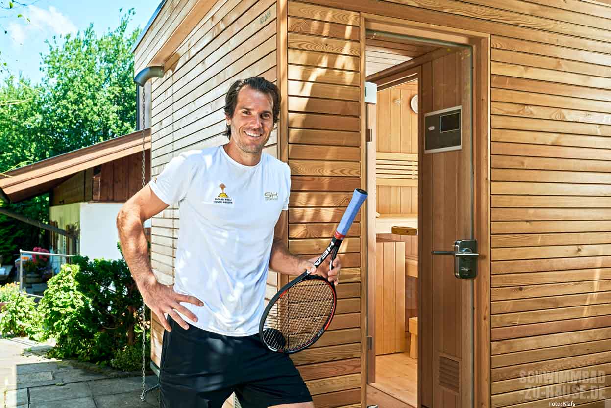 Schon immer ist der Gang in die Sauna für Tennis-Star Tommy Haas der perfekte Abschluss eines langen, fordernden Trainings- oder Wettkampftages. Deshalb hat er sich jetzt in seinem Wohnsitz im bayerischen Alpenvorland einen lang gehegten Traum erfüllt: Eine eigene Sauna im Garten. Genau richtig für die optimale Vorbereitung auf das Turnier in Wimbledon, das Anfang Juli startet.