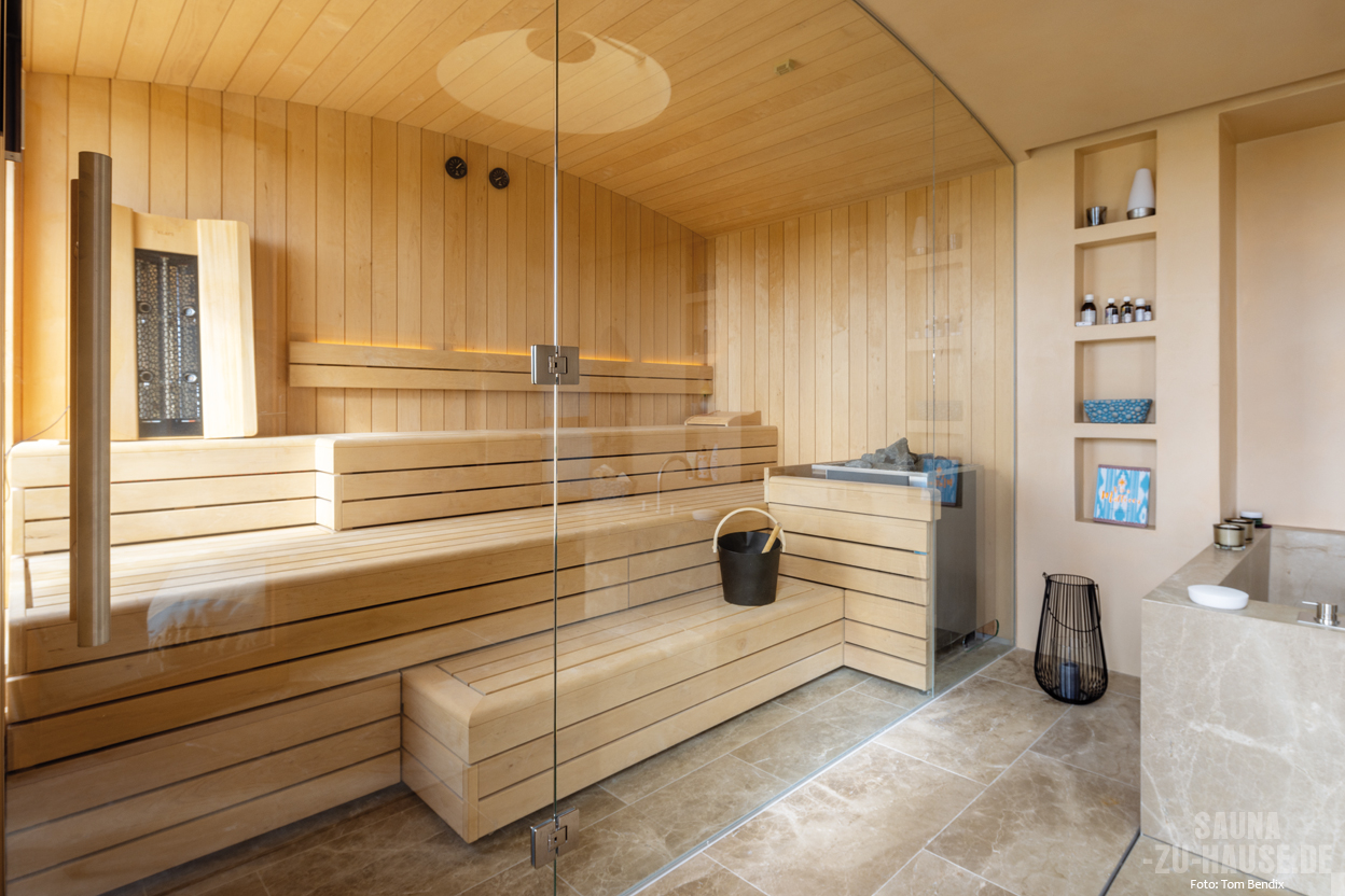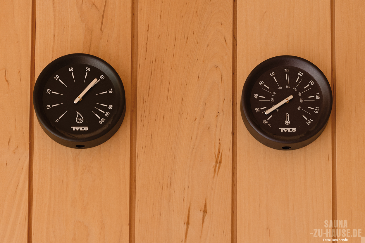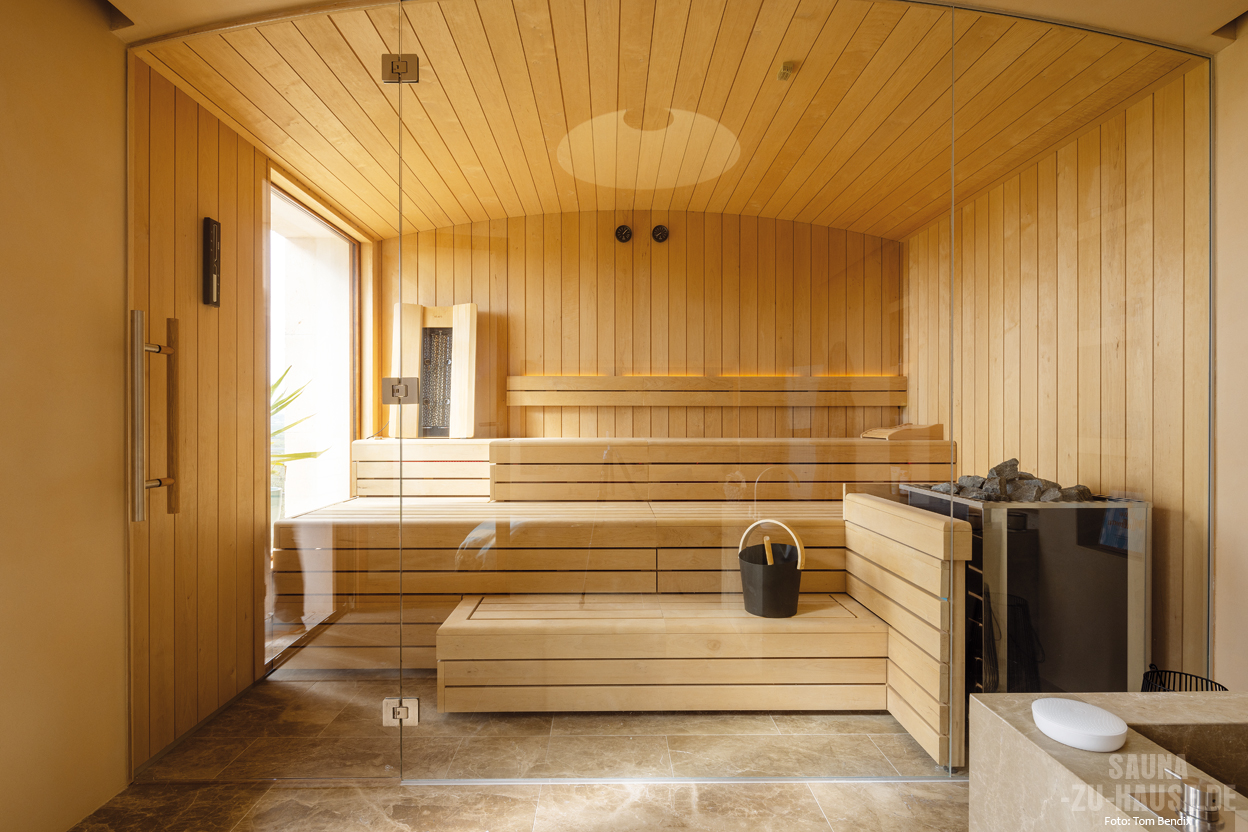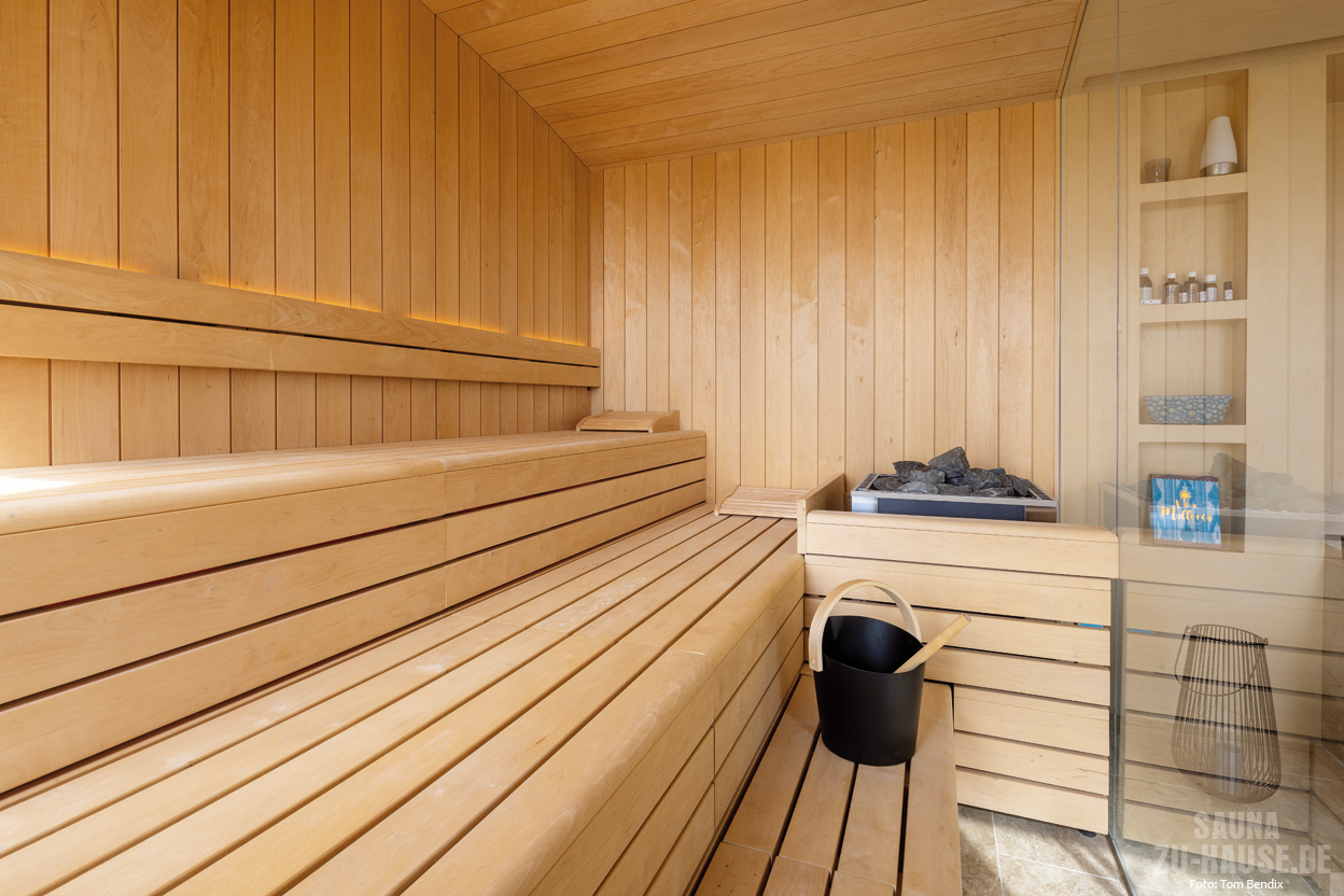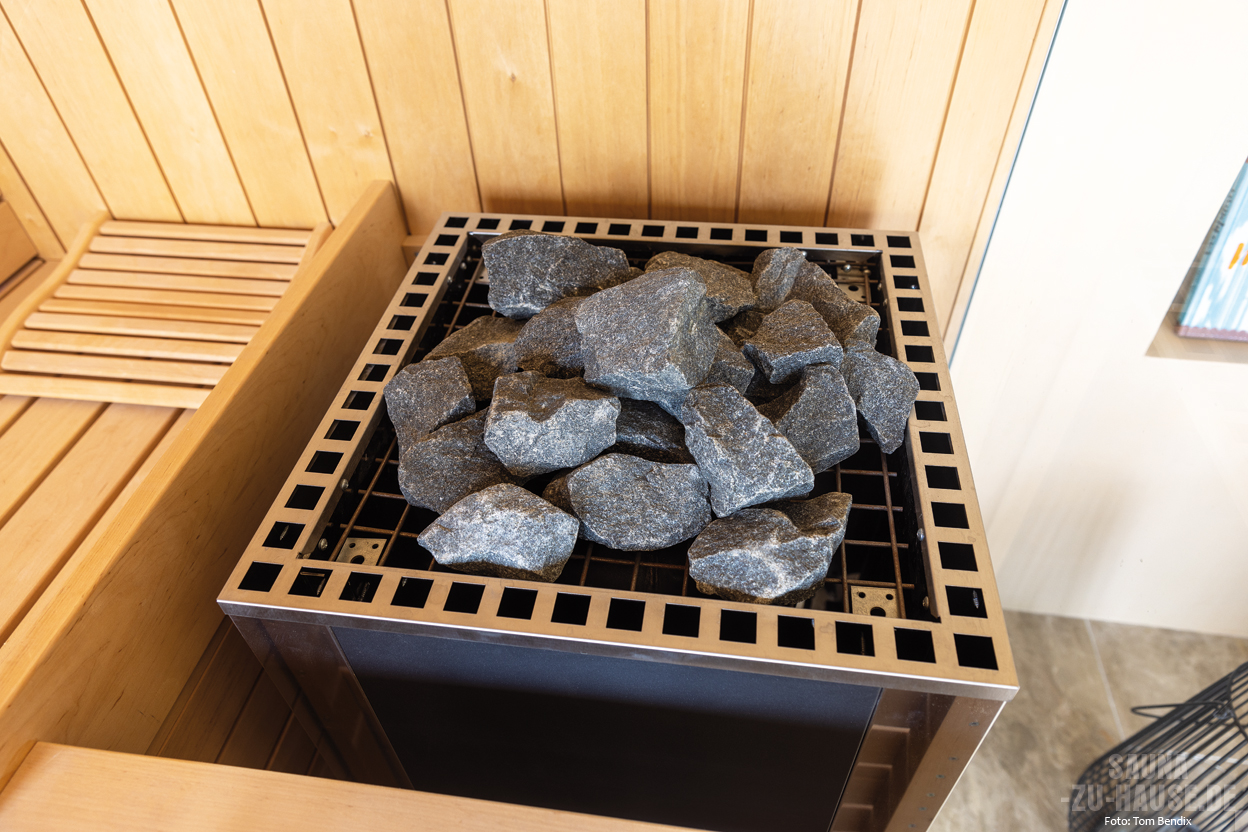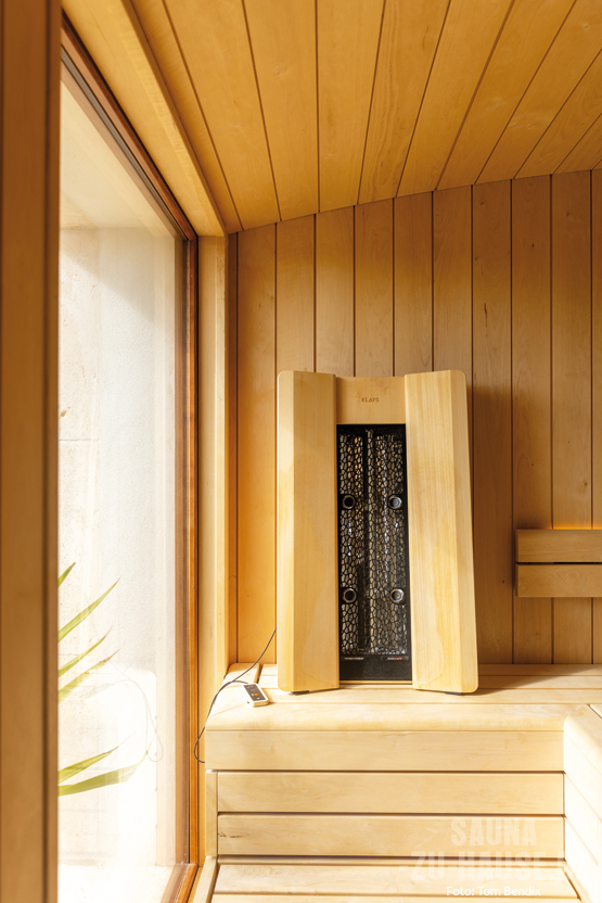 Vermittelt wurde die Tylö-Sauna, samt Ofen von Eos, von dem Wellness-Spezialisten Frank Grigull von der Firma Cubycal. Die Saunawand besteht aus geraden waagrechten Holzpaneelen, die sich bis zur Decke durchziehen. Dieses Set-Up wurde vom Besitzer nachträglich noch um einen Infrarotsitz von Klafs erweitert, um seinem Rücken zusätzlich etwas Gutes zu tun. Der Sitz befindet sich neben dem Fenster, sodass man beim Infrarot-Saunieren die weite Landschaft betrachten und bei jedem Wetter in doppelt gesunder Wärme genießen kann.