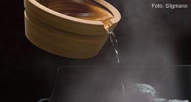 Unsere Nase nimmt nach einigen Minuten permanenter Beduftung den Geruch nicht mehr wahr, somit ist die Gefahr der Überdosierung hoch. Weiteres Kriterium für den perfekten Aufguss ist die Wassermenge, denn viel hilft nicht immer viel: Pro Kubikmeter Sauna gießen Sie 12 bis 20 Gramm Wasser auf die heißen Olivinsteine. Bei einem Praxisbeispiel einer Kabine mit einer Höhe von 2,20 m, 3 m Breite und 3,50 m Länge wäre die Aufgussmenge die eines kleinen 0,3 Bierglases. Das mit ansonsten 10-20 Prozent Luftfeuchtigkeit trockene Saunaklima schnellt mit dem Aufguss auf 30 Prozent Luftfeuchtigkeit an.
