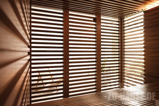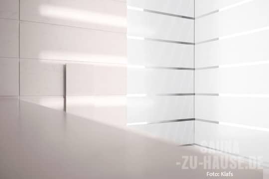 Bei der Sauna arbeitet Matteo Thun mit seinem Lieblingsmaterial Holz. Entstanden ist eine spannungsgeladene Optik, mit einem Wechselspiel aus Glas, Holzleisten und Fugen. Das eingesetzte Glas der Front und Seitenwände öffnet die Sauna optisch. So wird der Innenraum vom einfallenden Licht durchflutet, es entsteht ein Spiel aus Licht und Schatten. „Generell ist indirektes Licht bei unserer Arbeit ein wichtiges Element“, erklärt der Designer. „So sind auch bei der Sauna für Klafs lediglich die Kanten der großen Sitzstufen erleuchtet. Sie geben dem Raum optische Tiefe.“ Für den Betrachter liegen die Lichtquellen ebenso wie die Saunatechnik im Verborgenen. Ganz dem Prinzip der ungestörten Entspannung folgend, ist auch der Ofen dezent unter der Sitzbank platziert. Passend zu verschiedenen Vorlieben und Umgebungen kann die gesamte Holzausstattung der Sauna in Hemlock, Eiche oder Nussbaum ausgeführt werden.