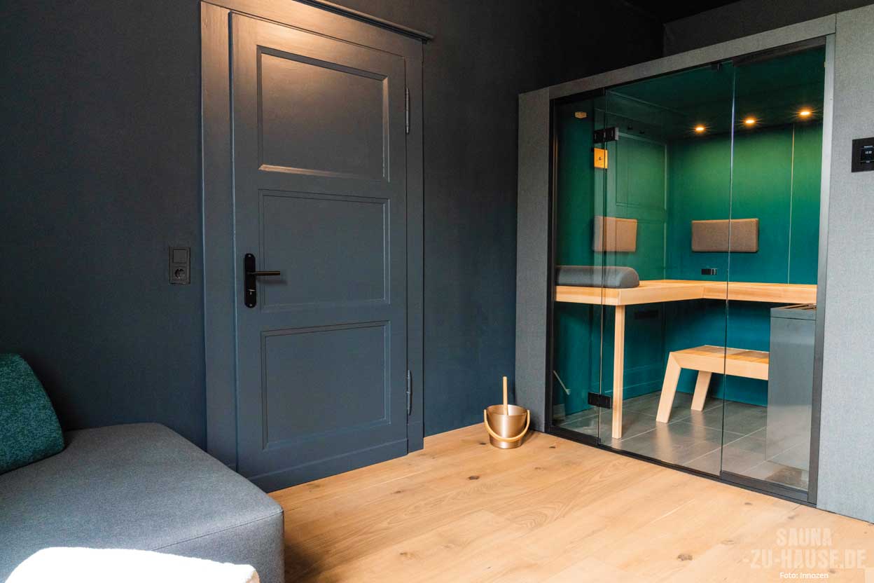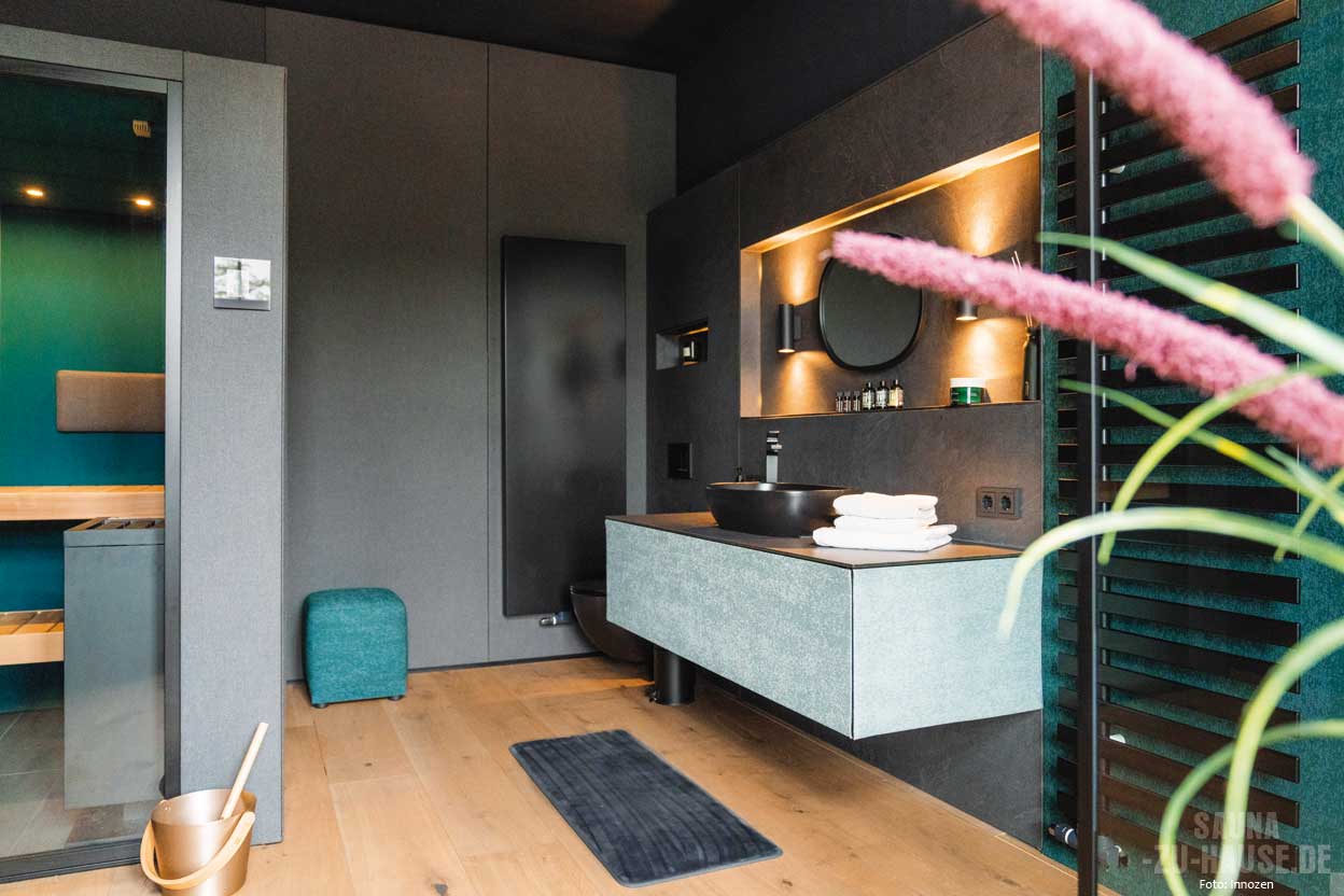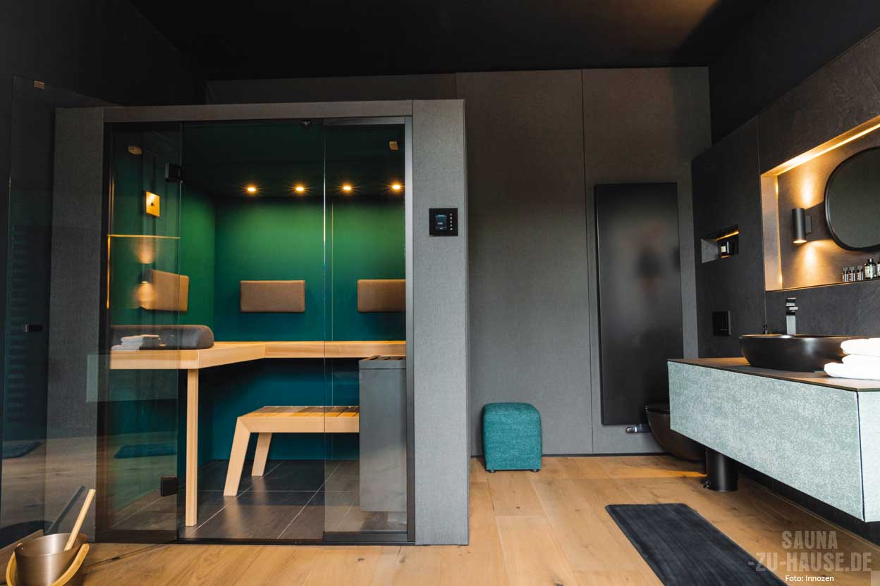 Das Herzstück ist das Badezimmer mit der „Innozen“-Sauna im Gästeappartement der Villa. Vor dem Umbau gab es hier weder Wasserleitungen noch ein Badezimmer. Doch mit viel Liebe zum Detail und technischer Raffinesse wurde der Raum in ein modernes Spa verwandelt. Wände, Decke und Innentür sind jetzt vollständig in Anthrazit gehalten, was dem Raum eine geheimnisvolle Tiefe verleiht. Diese mutige Farbwahl setzt sich bis zur Außenseite der „Innozen“-Sauna fort und fügt sich perfekt in die anthrazitfarbene Welt des Badezimmers ein. Grüne Stoffe setzen Akzente und verleihen dem Raum