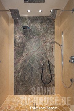 Bei der Ausstattung des Dampfbads mit Sternenhimmel entschied sich der Bauherr ebenfalls für ein Glasmosaik; hier strahlen die Steinchen in blauer Farbe. In der Erlebnisdusche mit Kopfbrausen, Regenduschen, Kneippschlauch und Co. sowie hinter der Wanne sind Rohtafeln aus dunklem Naturstein ein optisches Highlight. Sie ergänzen sich mit dem beigen Naturstein des Bodens, mit dem auch die große Wanne eingefasst ist. In der Wanne mit Whirlfunktion tummeln sich heute bevorzugt die Enkelkinder, die ab sofort die Geschichte des ehemaligen Pferdestalls auf neue, andere Art weiterschreiben.