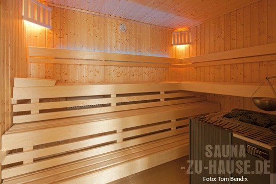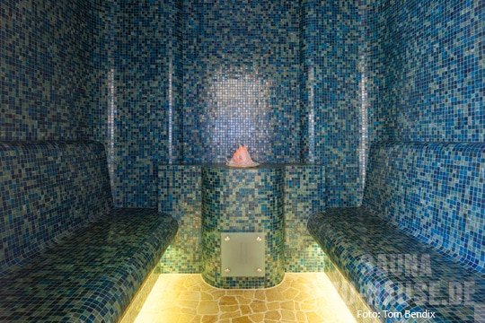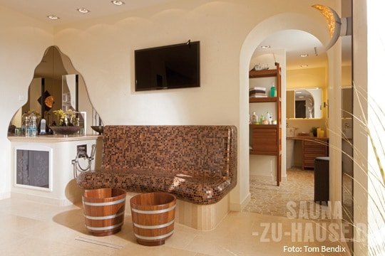 Ebenfalls maßgenau eingebaut ist die 2,60 breite und 2,00 tiefe Finnische Sauna aus nordischer Fichte. Beheizt wird sie durch einen Designofen aus Edelstahl, über dem eine Kräuter- und Salzschale für Aromadämpfe angebracht ist. Das dreistufige Liegesystem im Inneren der Sauna ist aus Espenholz gefertigt, ebenso wie die Zwischenbankverkleidung und die Kopfstützen. Die oberste Liegeebene ist für noch größeren Komfort ergonomisch geformt und der Körperform angepasst. Hinter den Bänken leuchtet bei Bedarf eine LED-RGB-Installation, bei der die Familie mittels einer Fernbedingung eine einzelne Farbe oder einen dynamischen Farblichtverlauf wählen kann. Nach dem Gang in die Sauna lädt eine Ruhesitzbank, die mit exklusiven Glasmosaiksteinen aus Italien besetzt ist, zur Erholung ein. Für die Fußbecken, die vor und zwischen den Saunabädern genutzt werden, wählte Neuhauser Holzbottiche, die er bei Nichtgebrauch flexibel und platzsparend zur Seite stellen kann.