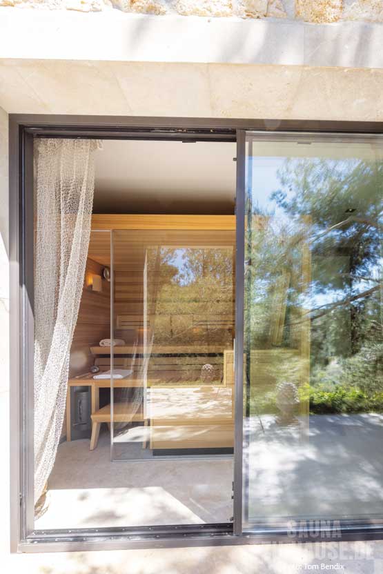 Der Bauherr, der unter Allergien leidet, schätzt die gesundheitlichen Vorteile des Saunierens besonders. Eine Sauna ist für ihn somit nicht nur ein Ort der Entspannung, sondern trägt auch zur Gesundheit bei. „Wir hatten bereits eine Klafs-Sauna in Berlin, die wir viel nutzen. Daher durfte auch in unserem Haus auf Mallorca eine Kabine nicht fehlen“, berichtet der Steuerberater im exklusiven Interview mit haus+wellness*. Gemeinsam mit dem Architekten Bartolome Blanch Carrio wurde die Sauna in die Planung des Hauses integriert. „Wir wünschten uns eine Sauna in der Nähe unseres Pools und mit einem großen Fenster, aus dem man in die Natur schauen kann.“