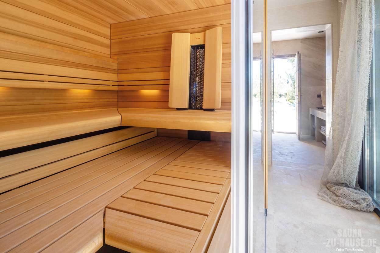 Bereits beim Betreten des gemütlichen Saunaraums durch den Vorhang und die große Glastür, die innen und außen verbindet, spürt man die einzigartige Atmosphäre dieser maßgefertigten Sauna. Das private Saunaprojekt, realisiert von Klafs aus Schwäbisch Hall, fügt sich harmonisch in das stilvolle Feriendomizil eines Berliner Steuerberaters ein. Nur wenige Schritte vom Pool entfernt, bietet die Sauna durch die integrierte Ganzglasfront einen herrlichen Blick auf die malerische Landschaft Mallorcas.