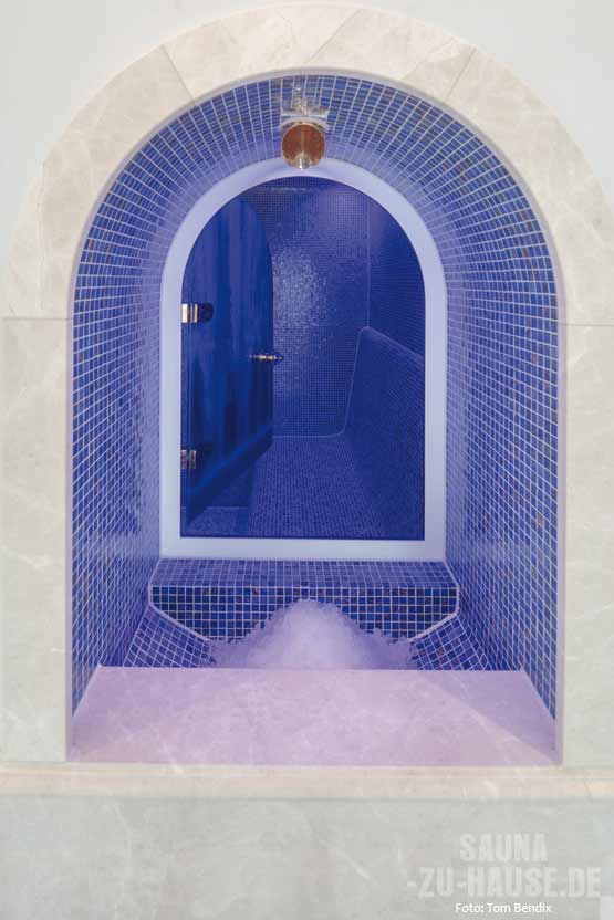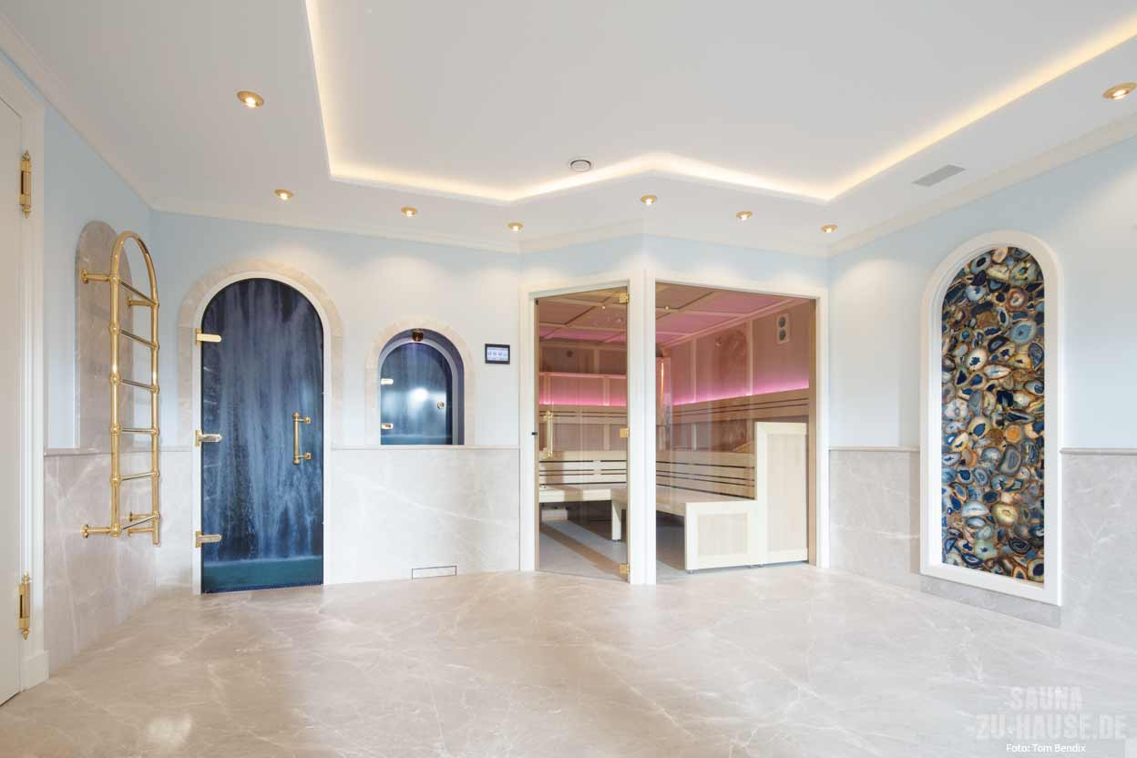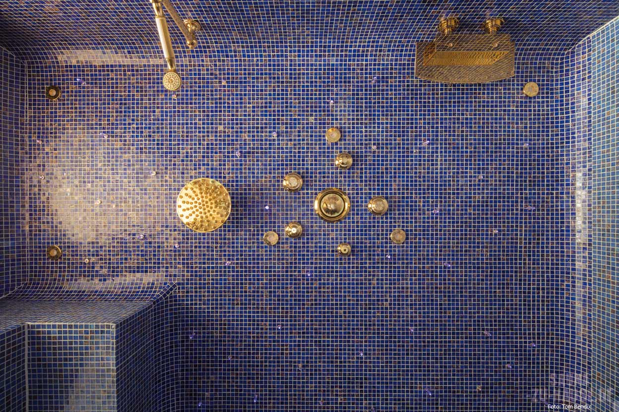 „Zunächst wünschten sich die Bauherren lediglich eine Sauna mit passender Dusche. Auf unser Anraten hin entschied sich das Ehepaar dann allerdings für ein Komplettprogramm, das auch ein mit Mosaiken verkleidetes, 2,5 x 3 Meter großes Dampfbad mitsamt eines integrierten Eisbrunnens hat“, erläutert Krause die Entstehungsgeschichte. Raffiniert: Der Eisbrunnen ist durch ein 75 x 43 Zentimeter großes Fenster direkt vom Dampfbad aus erreichbar. Dies bietet ein außergewöhnlich hohes Maß an Komfort. Im Dampfbad sorgt eine Attraktionsdusche für sinnliche Erlebnisse. Als wiederkehrendes Designelement wünschte sich der Bauherr vergoldete Highlights: Vom Heizungshalter über die Armaturen und Türgriffe bis hin zu den Deckenleuchten kann man es jetzt golden schimmern sehen.