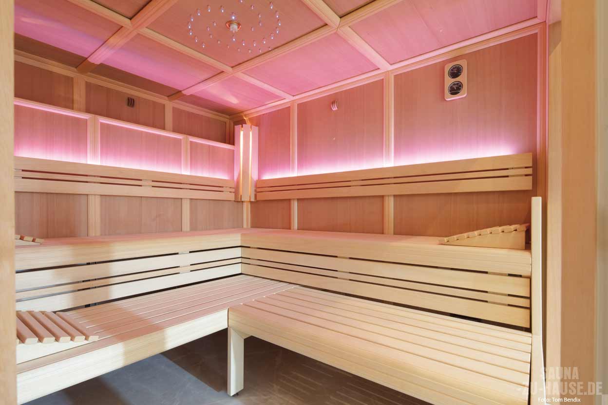 Abachi und dunkler Hemlocktanne charakterisiert ihr schlichtes, modernes Design. Die von den Profis speziell verbaute Technik wiederum sorgt dafür, dass hier gleich zwei Badeformen möglich sind: feuchte und traditionelle Sauna. Dank LED-Beleuchtung, unendlichem Sternenhimmel und Musiksystem wird der Aufenthalt in der Sauna noch ein Stückchen luxuriöser.