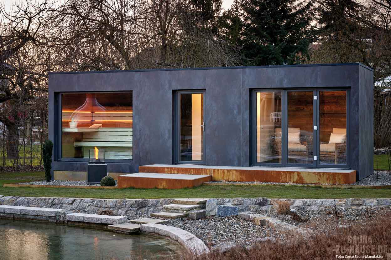 Der „Spa Cube“ von der Corso Sauna Manufaktur beispielsweise ist ein Saunahaus im intelligenten Modulsystem, bei dem die Außensauna auf Wunsch durch weitere Module erweitert werden kann, wie etwa mit einer Outdoorküche, einem Arbeitszimmer im Freien, einer Lounge oder einem Gästezimmer. So kann die Sauna praktisch ergänzt werden und ganz den individuellen Kundenwünschen und Bedürfnissen angepasst werden. Auch das Aussehen und die Materialität des „Spa Cubes“ sind hochmodern: Die langlebige Außenhaut besteht aus dem Material „Ceramic Archskin“, verlegt in großformatigen Platten, die ein sehr ruhiges, edles Gesamtbild kreieren. Zu den Eigenschaften des Materials gehören Feuchtigkeits-, Frost- und UV-Beständigkeit. Außerdem ist es extrem fest (gebrannt bei 1.220 °C), pflegeleicht, ultra-dünn und sogar leichter als Aluminium.