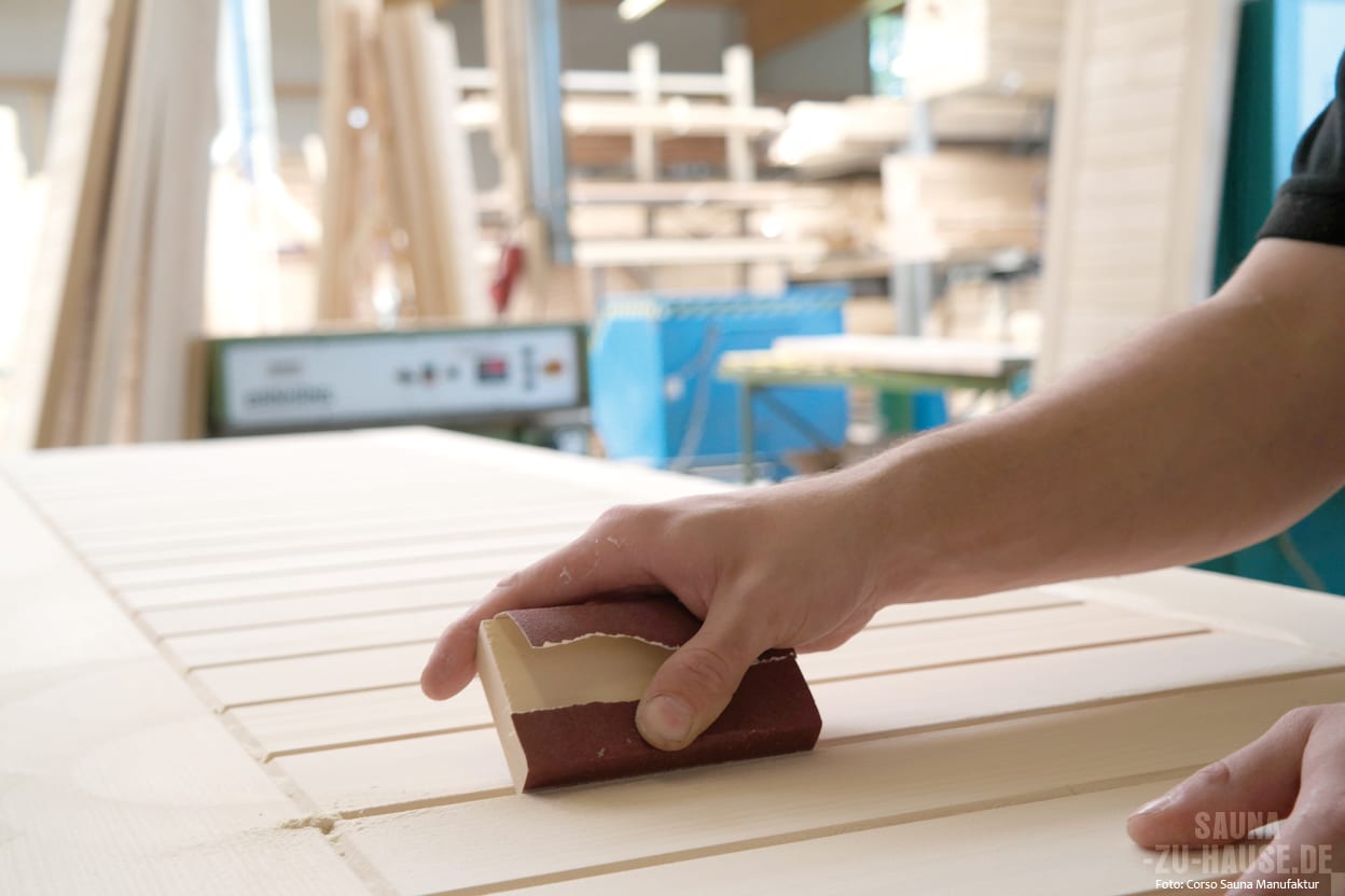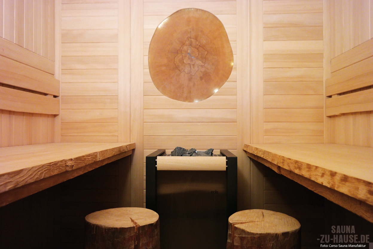 Im Massivholzsaunabau spielt Handarbeit eine herausragende Rolle. So werden Qualität und Individualität garantiert. Die Corso Saunamanufaktur verwendet in der Produktion ihrer Kabinen ausschließlich hochwertige und unbehandelte Rohstoffe. Hierbei kann der Kunde zwischen verschiedenen Holzsorten zu wählen. Die Massivholzsauna wird mit einer Wandstärke von 55 Millimeter gefertigt. Die Wandelemente stehen dabei auf einem höhenverstellbaren Sockel, sodass kleine Bodenunebenheiten ausgeglichen werden können. Bei der Planung der Sauna richtet Corso sich komplett nach den individuellen räumlichen Gegebenheiten und fertigt jede einzelne Massivholzsauna nach Maß speziell an, sodass auch die Umsetzung beispielsweise mit einer Dachschräge oder in einer Ecke kein Problem ist. Die Wände werden mit profilierten Massivholz-Bohlen aus Weißtanne oder nordischer Fichte gebaut, die wahlweise waagerecht oder senkrecht verbaut werden. Die stufenförmig angeordneten Saunaliegen fertigt Corso wahlweise aus Massivholz oder aus splint- und astfreiem Espenholz, da dies eine besonders angenehme Haptik hat und schwach wärmeleitend ist. Die unteren Liegen sind verschiebbar, um die Bodenreinigung zu erleichtern. Umlaufende Rückenlehnen und Kopfstützen sorgen zusätzlich für optimalen Sitzkomfort.