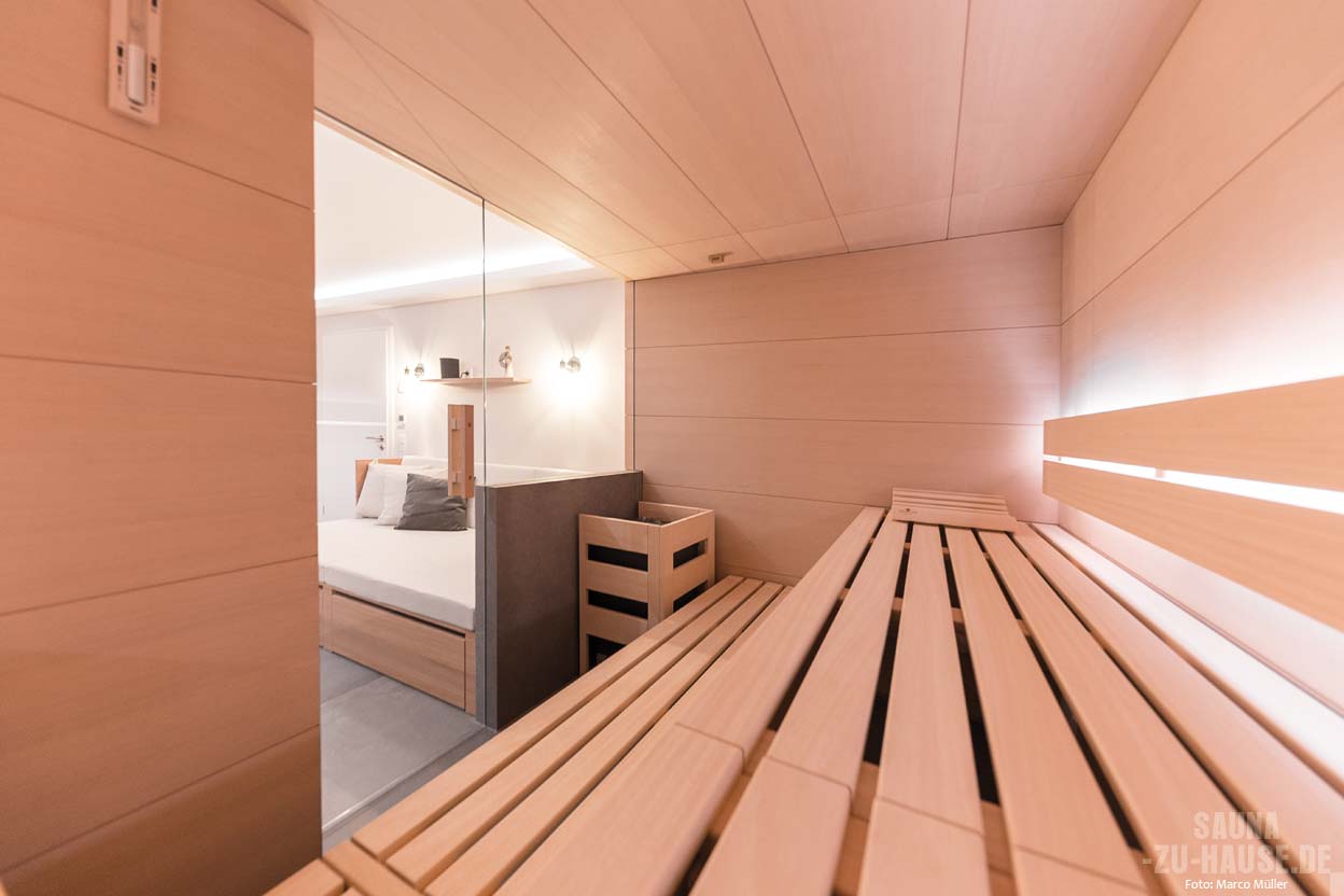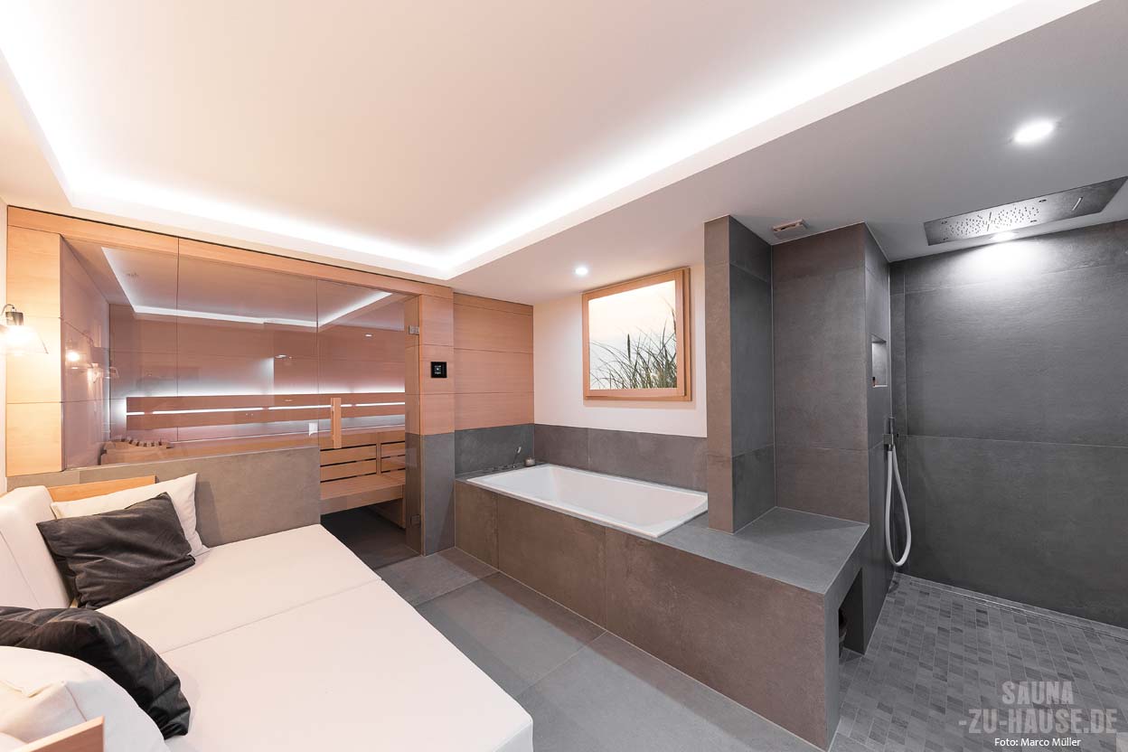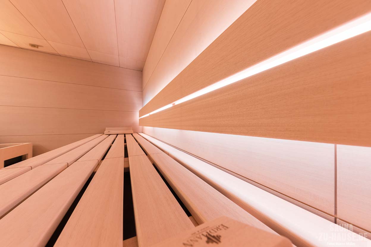 Dieses Konzept lässt sich auch bei der Saunakabine beobachten: Innenverkleidung, Saunabänke und Glasfront präsentieren sich überaus geradlinig und schlicht. Während die Saunapaneele aus hochwertigem Hemlock-Holz sind, schafft die große Glasfront hierzu einen spannenden optischen Kontrast was den Saunierenden von der Bank aus den Blick in den Wellnessraum bietet. Dank der Kombination der Materialien untereinander wurde nicht zuletzt ein harmonisches Wohlfühl-Ambiente geschaffen.