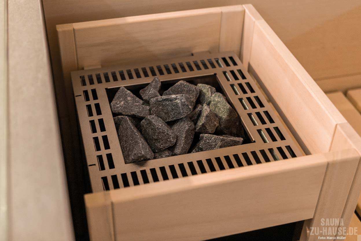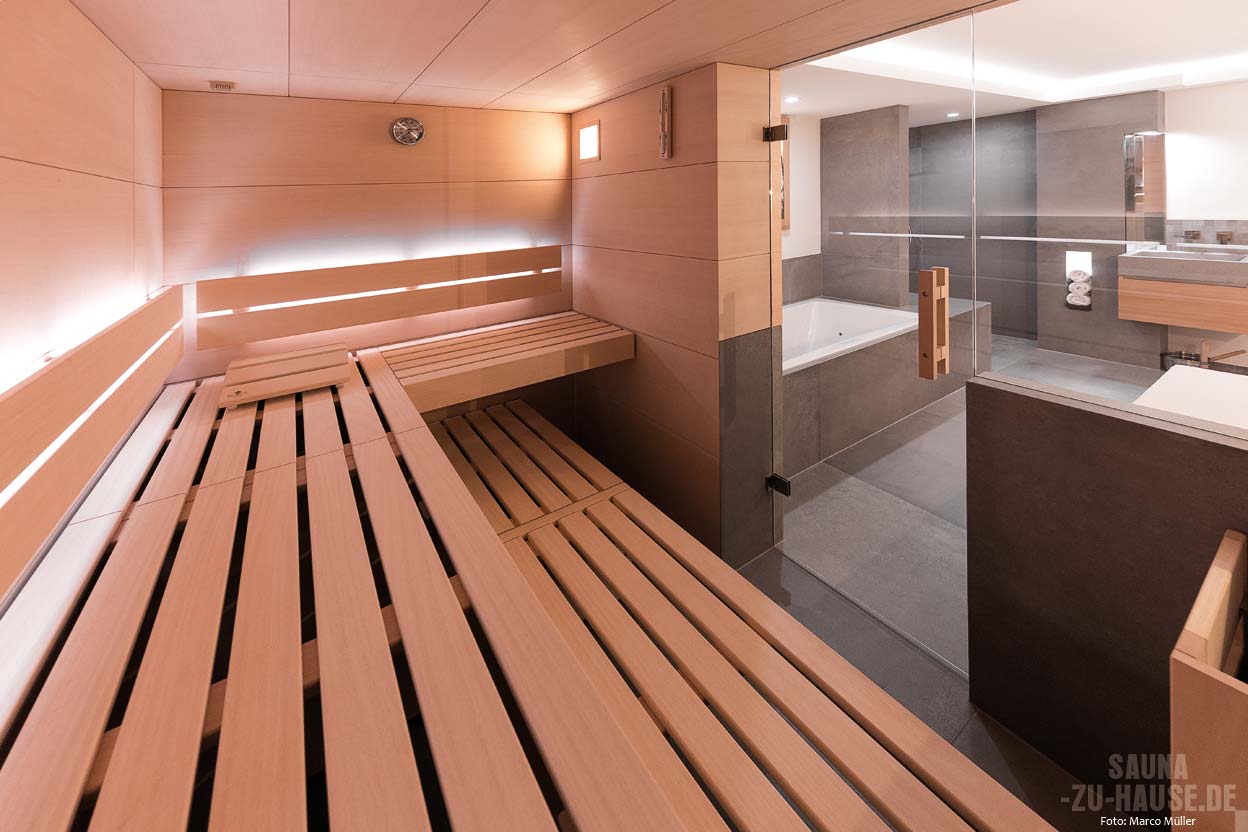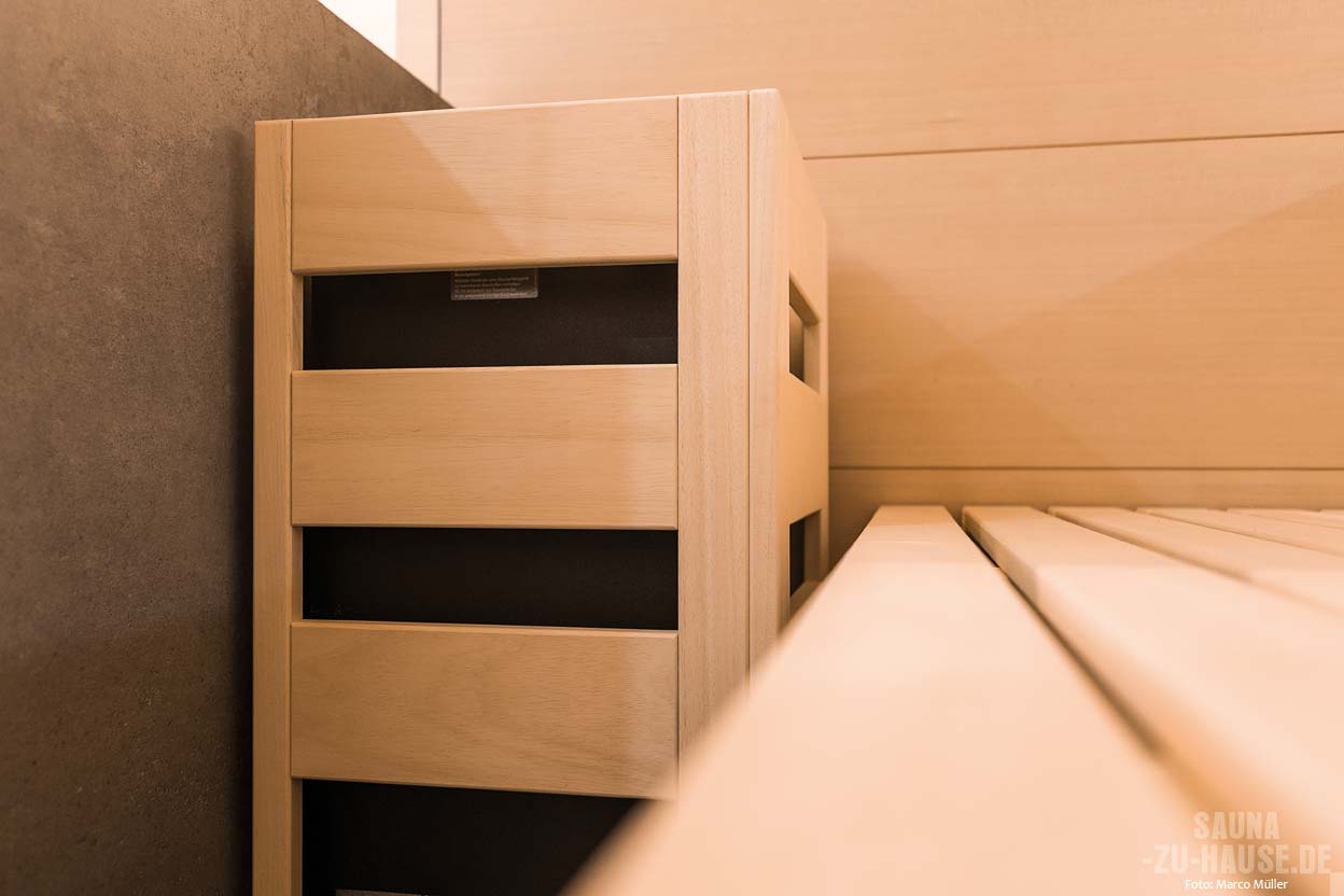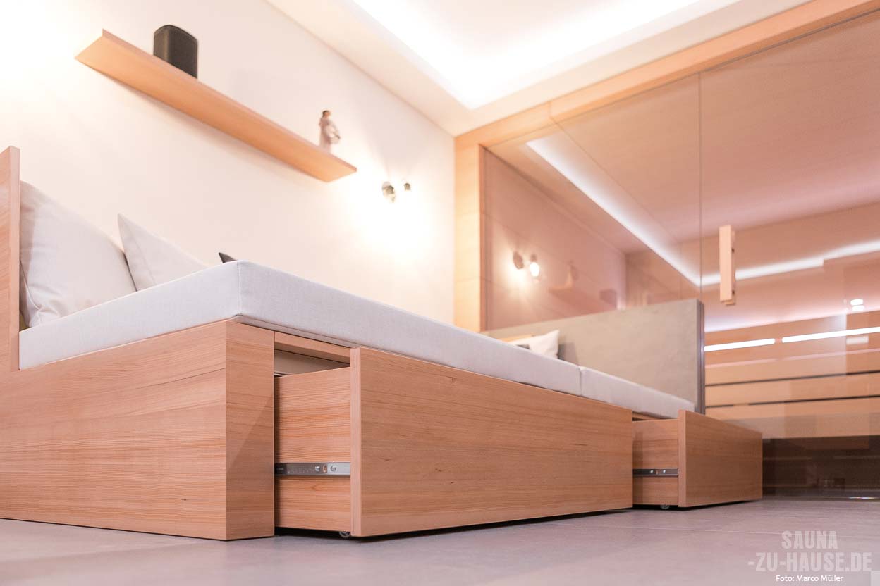 Dieses Konzept lässt sich auch bei der Saunakabine beobachten: Innenverkleidung, Saunabänke und Glasfront präsentieren sich überaus geradlinig und schlicht. Während die Saunapaneele aus hochwertigem Hemlock-Holz sind, schafft die große Glasfront hierzu einen spannenden optischen Kontrast was den Saunierenden von der Bank aus den Blick in den Wellnessraum bietet. Dank der Kombination der Materialien untereinander wurde nicht zuletzt ein harmonisches Wohlfühl-Ambiente geschaffen.