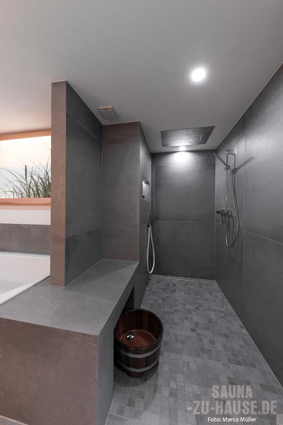 Wenn jeder Meter eines Wellnessraumes optimal ausgenutzt wird, ohne, dass ein Gefühl der Enge entsteht, weiß man, dass erfahrene Meister am Werk waren. Bei diesem Saunaprojekt mit Whirlwanne und Dusche sind die Materialien Holz und Beton passend miteinander kombiniert worden.