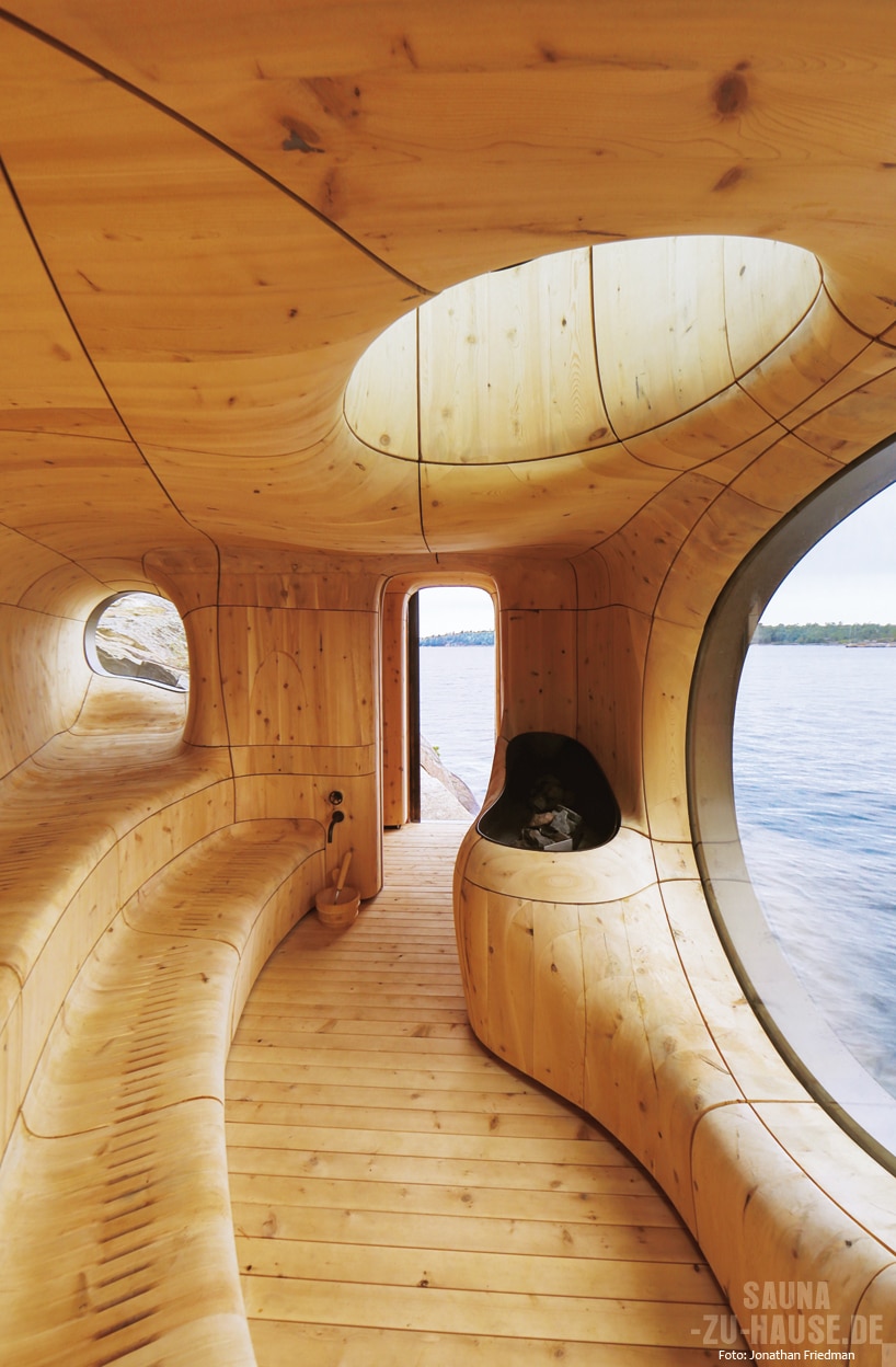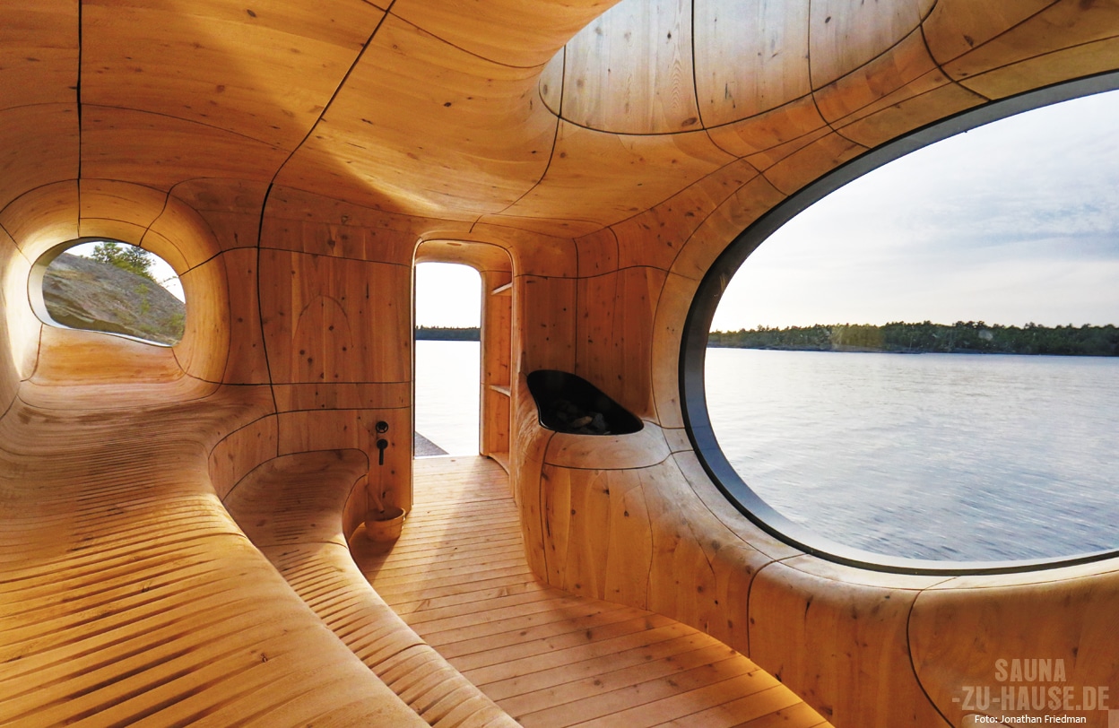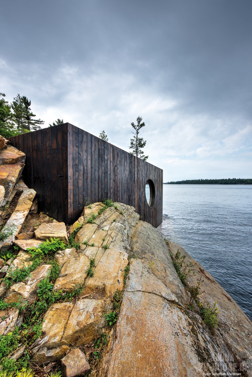 Für sein Urlaubsdomizil am See Huron in Kanada – zu erreichen mit einem Langstreckenflug – wünschte sich dieser Bauherr eine Sauna mit außergewöhnlichem Charme – einen skulpturalen Raum im Einklang mit der Natur. Optisch sollte die Sauna mit der felsigen Umgebung verschmelzen. Dieser kniff-ligen Aufgabe nahmen sich die Architekten von Partisans an. Jetzt schmiegt sich die neue Wellnessoase mit ihren weichen, organischen Formen nahtlos an die raue Felswand: Beim Saunieren geben runde Fenster den Blick auf den See frei, während es für den Cool-down einfach ab ins kühle Seewasser geht.