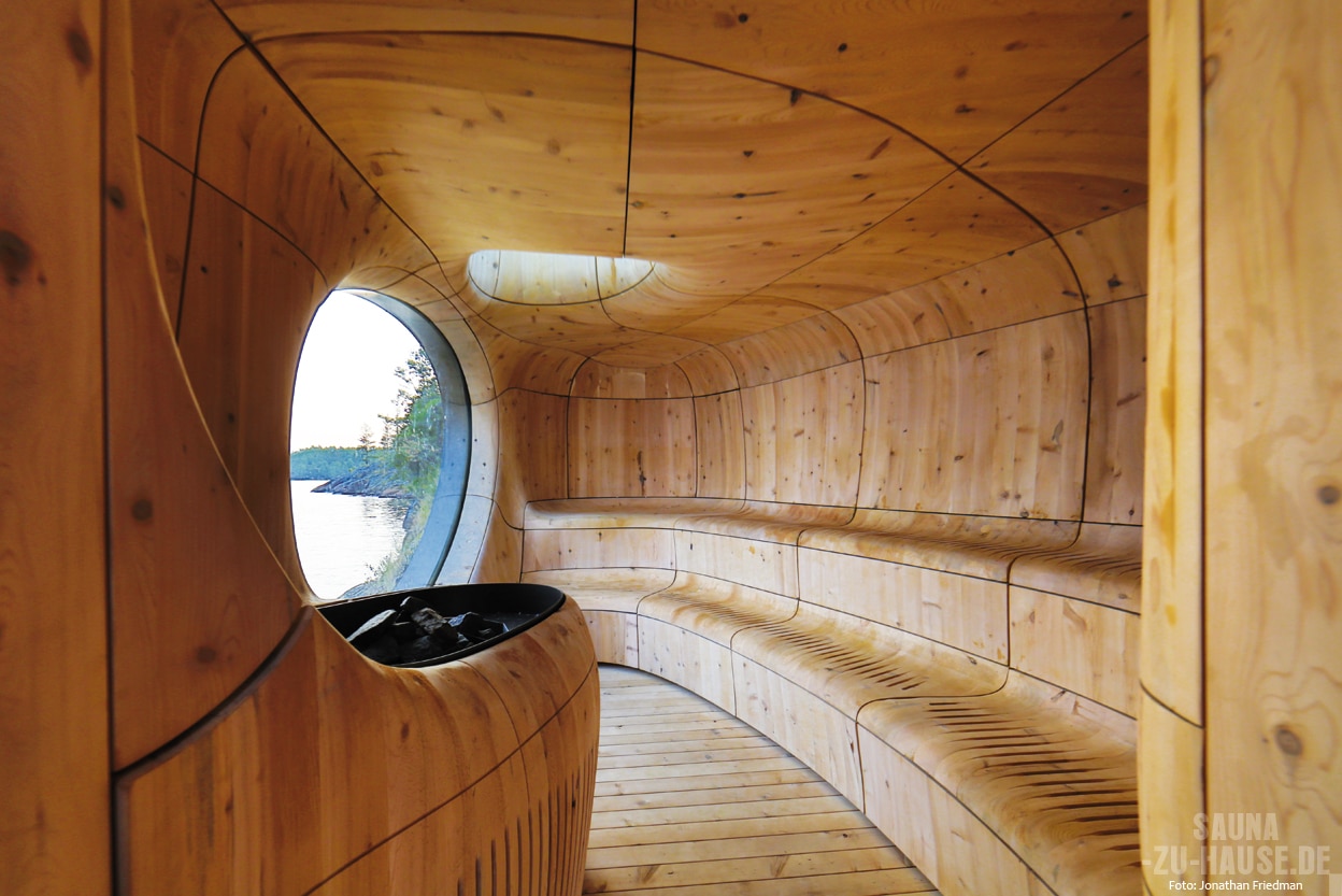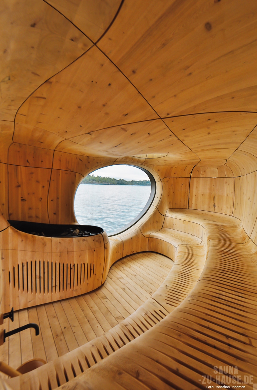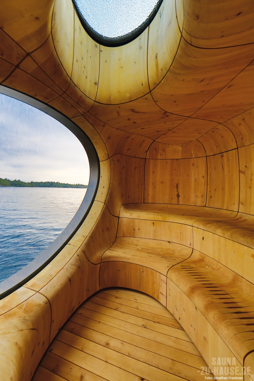 Ein gesundes Lüftungssystem und auch das dauerhafte Aufrechterhalten einer exakten Temperatur waren eine besondere Herausforderung für die Architekten: Da die jährlichen Temperaturen in der kanadischen Provinz Ontario zwischen 35 und – 35 Grad schwanken, musste eine besondere Lösung her: Ein fast zehn Zentimeter breiter Luftspeicher, eine Barriere aus spezieller Aluminiumfolie, eine Hülle aus Sperrholz, eine Stahlkonstruktion mit Holzrahmen, Schaumisolierung und eine wasserfeste Schicht vereinen sich, um die Hitze gleichmäßig zu verteilen und den Verlust von Energie zu minimieren. Das Geheimrezept lautet eindeutig Balance: Denn ein ausgewogenes Verhältnis zwischen ausreichend frischer Luft und heißen Saunatemperaturen mittels zweier Öfen muss fein justiert sein, damit die großzügige Sauna nicht auskühlt. Zwei ovale Fenster, die an Bullaugen eines Schiffes erinnern, und ein Oberlicht, durch das man in der Nacht den Sternenhimmel sehen kann, tragen mit einer dreifachen Verglasung dazu bei, dass die Temperaturen im Inneren konstant bleiben.