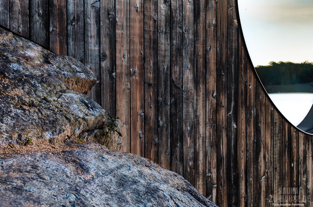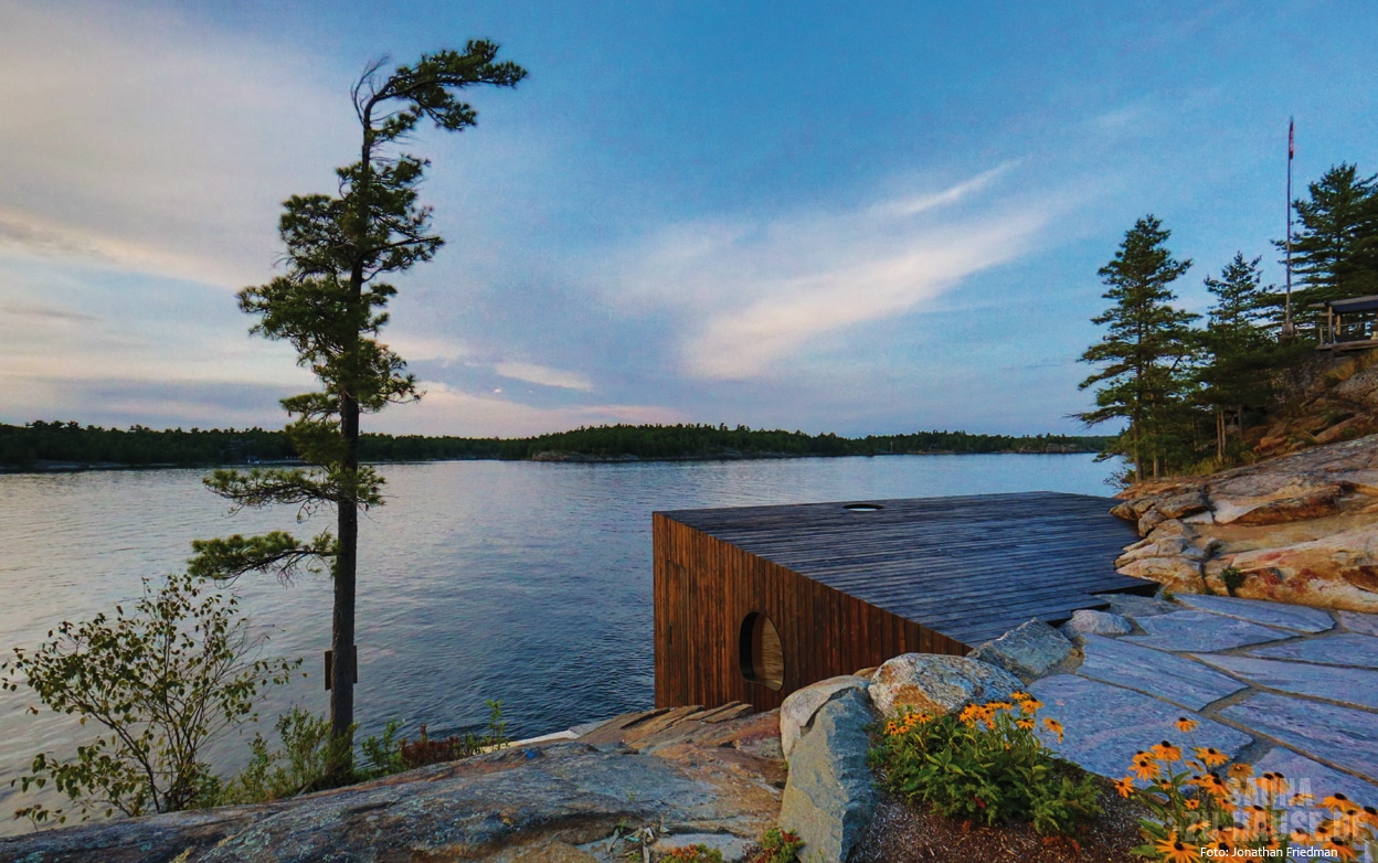 Diesen Gedanken verfolgte auch ein Geschäftsmann aus Ontario, als er sich entschloss, auf seiner privaten Insel eine Sauna der Extraklasse errichten zu lassen. „Da es in unseren Breitengraden viele Monate im Jahr sehr kalt ist, sind meine Frau und ich passionierte Saunagänger. Auch im Urlaub, in unserem Ferienhaus, wollten wir auf dieses großartige Erlebnis nicht verzichten“, erläutert der Bauherr seine Idee. Hierbei war es dem Paar wichtig, dass die Sauna von außen schlicht und unauffällig ist: Das natürliche Bild der Landschaft dürfte durch den Bau so wenig wie möglich gestört werden. Im Inneren dagegen sollte die Sauna eine völlig neue Welt mit Luxuselementen eröffnen. Natürlichkeit und unbehandelte Materialien wie heimische Hölzer waren von Beginn an ein weiterer Gestaltungswunsch. Um den weitläufigen See immer im Blick zu haben und unmittelbar nach dem Saunagang ins erfrischende Wasser springen zu können, entschied man sich gemeinsam mit den beauftragten Architekten Partisans für eine Lage am Granitfels – beinahe auf Höhe mit dem Wasserspiegel des Sees.