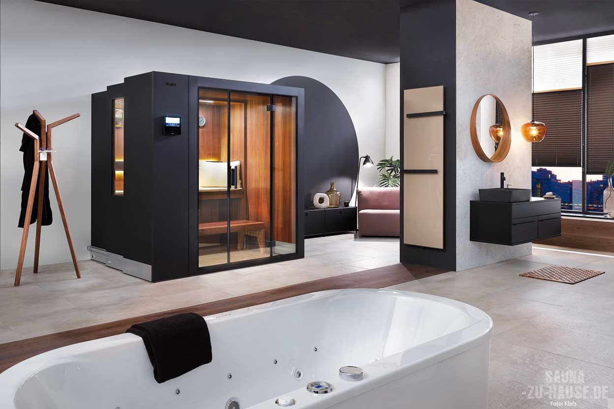 fähigem Material in Schwarz verkleidet, das eine elegante, moderne Optik mit Anti-Fingerprint-Effekt bietet. Trotz ihrer kompakten Größe bietet die „S1“ Sauna alle Vorteile einer klassischen Sauna und ist umweltfreundlich zertifiziert. | www.klafs.de