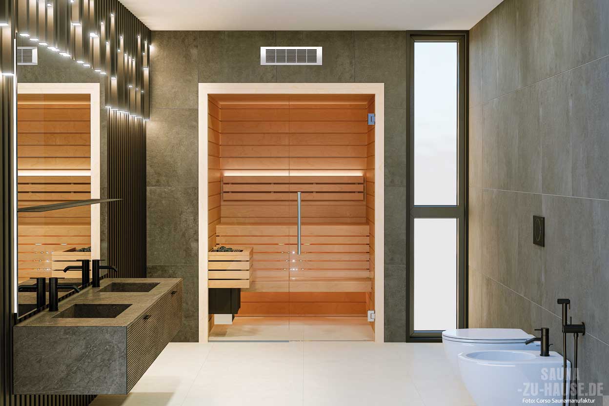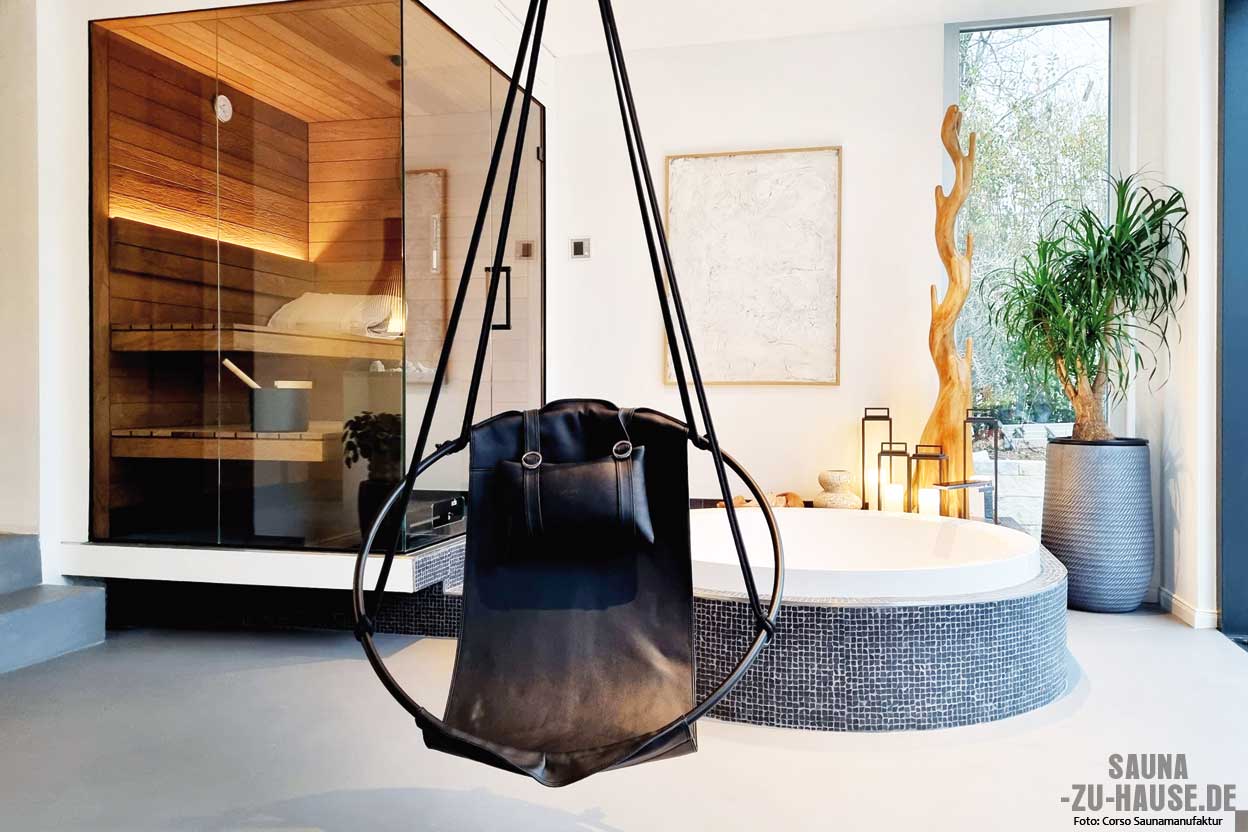 Diese maßgefertigte Ecksauna von Corso mag zwar klein sein, doch sie beeindruckt durch ihre geräumige Wirkung dank der zweiseitigen Verglasung über Eck für ein großzügiges Raumgefühl und den schwebenden Saunabänken. Die Gestaltung aus Thermo-Espe verleiht der Sauna einen modernen und zugleich gemütlichen Charme. Trotz des begrenzten Platzes wurde das Maximum an Komfort und Luxus herausgeholt, was zu einer rundum gelungenen Wellness-Oase geführt hat. | www.corsosaunen.de