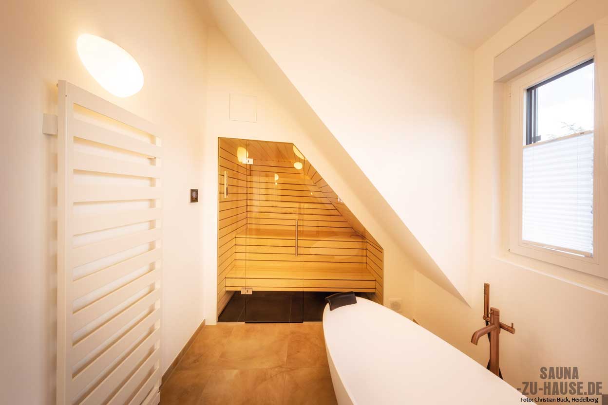 Eingebettet in die charmante Schräge eines Dachgeschosses erstrahlt die Sauna von Jockers in einem einladenden Ambiente aus hellem Holz. Die Linienführung der Dachschräge harmoniert perfekt mit dem natürlichen Holzton, der den Raum optisch öffnet und eine luftige, einladende Stimmung schafft. Das helle Holz reflektiert das einfallende Licht und verstärkt so das Gefühl von Helligkeit und Weite, trotz der begrenzten Raumhöhe. | jockers.de