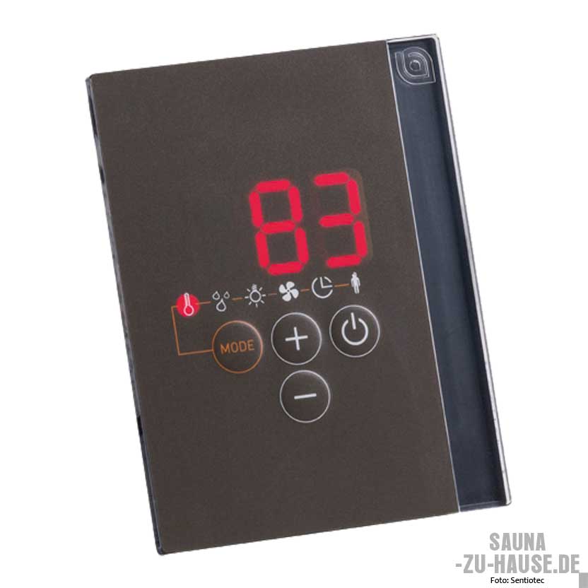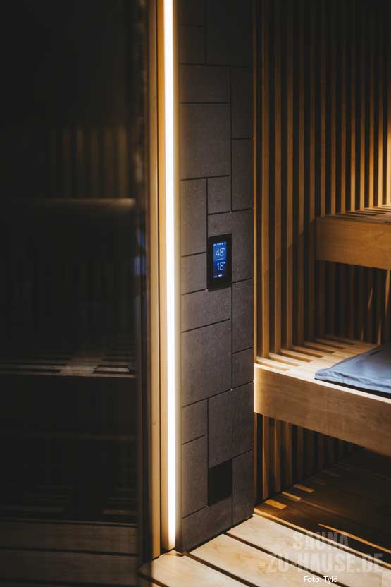 Eine Saunasteuerung besteht im Wesentlichen aus drei Funktionsteilen: dem Bedienteil, dem Lastteil und dem Fühler. Das Lastteil ist das elektronische Herz der Steuerung und übernimmt die Regelung des Saunaofens sowie des Saunaklimas. Früher waren Last- und Bedienteil eine Einheit, doch heute sind elegante, flache Displays gefragt, die separat vom Lastteil untergebracht werden. Das Lastteil kann unsichtbar über der Saunadecke montiert werden, während das Display im Saunaraum eine einfache Bedienung ermöglicht. Damit die Steuerung die Temperatur in der Kabine korrekt erfassen kann, ist ein Temperaturfühler erforderlich. Moderne elektronische Fühler haben die älteren Kapillarrohrfühler nahezu vollständig abgelöst. Diese sind einfacher zu installieren und messen exakter. Der Temperaturfühler wird an der heißesten Stelle in der Kabine, im Deckenbereich über dem Saunaofen, angebracht und erfüllt gleichzeitig eine Sicherheitsfunktion. Bei Erreichen von maximal 139 Grad Celsius wird der Ofen zwangsabgeschaltet, um die Sicherheit zu gewährleisten.