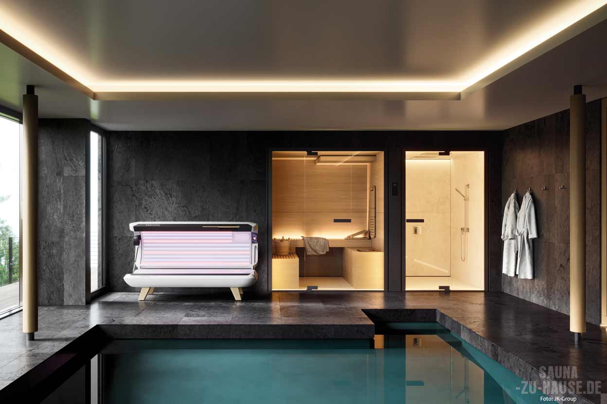 Eine weitere Möglichkeit die positiven Eigenschaften der Sonne zu Hause in vollen Zügen zu nutzen, ist die „Sonnenwiese“ von Klafs. Hier gibt es zwei Varianten mit unterschiedlichen Wirkungen: Die „Sonnenwiese K“ regt mit wohltuenden Wärmestrahlen die Kollagenbildung und somit den natürlichen Erneuerungsprozess der Haut an. Diese wirkt dadurch straffer und glatter. Mit der „Sonnenwiese U“ wiederum können Sie einen schonenden Bräunungseffekt erzielen. Dabei wird Melanin, das für die Bräunung der Haut verantwortlich ist, neu gebildet. Gleichzeitig regen sanfte UV-Strahlen die Weiterleitung des bereits vorhandenen Melanins in die oberen Hautschichten an. Neben einer lang an-