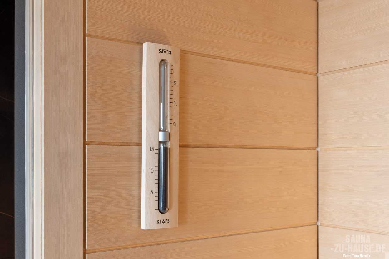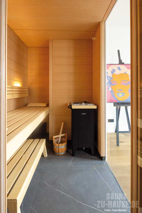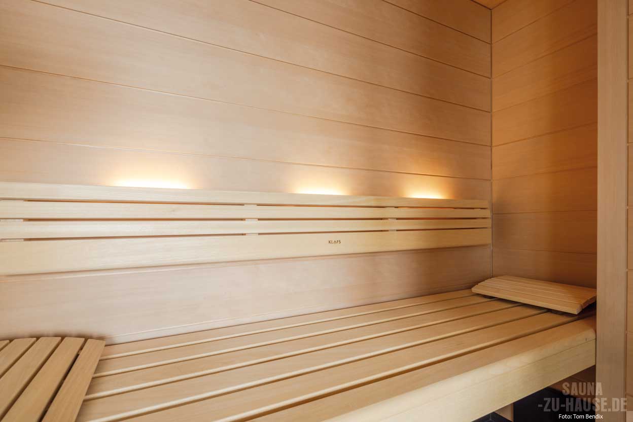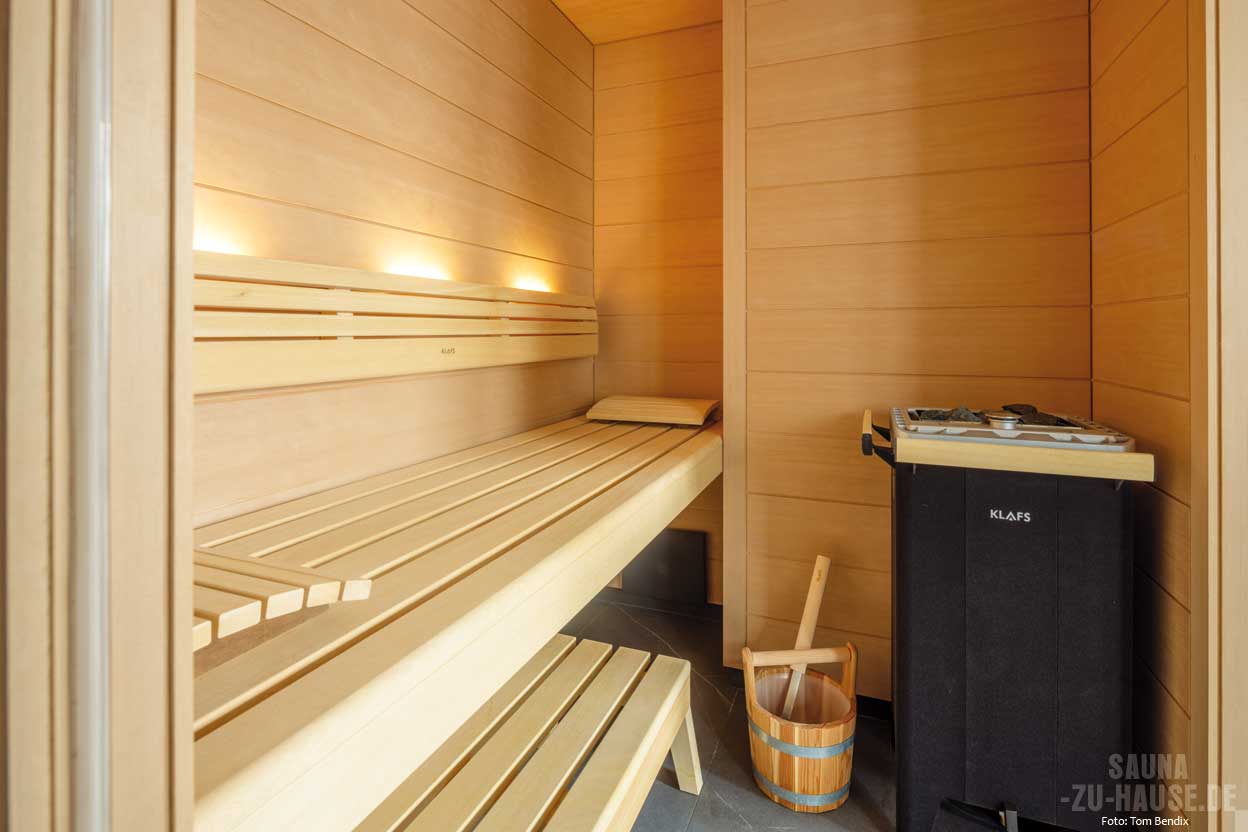 Und das brauchte es auch: Der Raum gab für die geplante Sauna nicht nur begrenzten Platz her – auch die Bebauung um eine Ecke und die Glasanlage zum Fitnessbereich machten aus dem Projekt eine besondere Herausforderung. „Mit unserem hohen Anspruch an Design und Präzision haben wir dank einer effizienten Nutzung der Räumlichkeiten und einer durchdachten Raumgestaltung allerdings eine Maßanfertigung realisieren können, die die handwerkliche Kompetenz von Klafs ein weiteres Mal unter Beweis stellt“, so Frubrich. Das Ergebnis ist eine 170 cm x 220 cm große Erholungsoase, die sich nahtlos in den Spa-Bereich integriert. Die Sauna „Premium“ mit dem Sauna- und Sanarium-Ofen „Fero“ passt Luftfeuchtigkeit und Temperatur ganz automatisch an die individuellen Wünsche an. Somit stehen fünf verschiedene Badeformen, wie zum Beispiel das Softdampfbad mit milderen Tem-peraturen und hoher Luftfeuchtigkeit zur Verfügung. „Besonders nach dem Sport schätzen wir das Ritual einer kalten Dusche mit anschließenden Saunagängen. Auch im Winter erweist sich die Sauna als unschlagbar“, so die Eigentümerin.