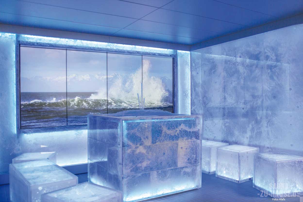 Eisbrunnen und Schneekabinen sind in privaten Saunabereichen wohl eher selten zu finden, in Wellnesshotels und Day Spas aber ein absolutes Highlight und faszinierender Frische-Kick: Abkühlen in einer Winterlandschaft, während Eis und Schnee für ein prickelndes Gefühl auf der Haut sorgen. Tiefe Atemzüge in der trockenen, kalten Luft haben einen intensiven Kühleffekt ohne den dazugehörigen Kälteschock.