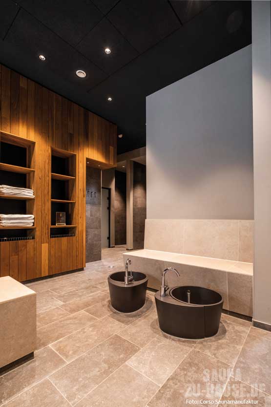Da Wasser mehr Wärme als Luft aufnimmt, sind anschließend Kaltwasseranwendungen angesagt: im Tauchbecken, mit einem Kneippschlauch oder unter der Dusche. Schwalleimer, die sich schlagartig entleeren, sorgen für eine direkte Erfrischung, während die klassische kalte Dusche einfacher und schonender ist und sich die Temperatur individuell dem persönlichen Empfinden entsprechend regeln lässt. Am besten beginnen Sie am weitesten entfernt vom Herzen, also mit dem rechten Bein, gefolgt vom linken Bein sowie dem rechten und linken Arm. Danach folgt der ganze Körper. Erlebnisduschen mit Nebel- oder Regeneffekten und den passenden Lichtszenarien machen die Abkühlphase zu einem ganzheitlichen Erlebnis.