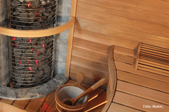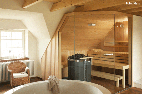 Aber nicht nur die Kabinenwände haben sich verändert, auch so manch anderes Element der Schwitzkabine hat eine Wandlung erfahren. Etwa die Saunaliegen: Gab es früher nicht allzu viel darüber zu sagen – es waren nun mal bloß Holzbretter, die Platz boten – erkennt man jetzt, dass auch sie Akzente im Saunadesign setzen können. Etwa durch die farbliche Absetzung zum Rest des Kabineninneren. Oder durch ihre Konstruktion: Es gibt Saunabänke, die aufs Wohlgefallen zielen, etwa scheinen sie beinahe frei zu schweben, aber auch Bänke, die den Komfort unterstreichen, indem sie ergonomisch geformt wurden. Ebenso der Saunaofen rückt in den Blickwinkel – oder hinaus. Denn auch beim Einheizer gibt es zwei konträre Trends. Der eine stellt ihn optisch als das dar, was der Ofen in der Sauna auch ist: das Herzstück der Kabine. Der Fantasie scheint bei den Herstellern keine Grenze gesetzt zu sein: verwegene Konstruktionen mit umlaufend offen einsehbaren Saunasteinen bis hin zu stylishen Specksteinummantelungen. Der zweite Trend sieht genau das Gegenteil vor, der Ofen wird als Hinterwand- oder Unterbankmodell „versteckt“.