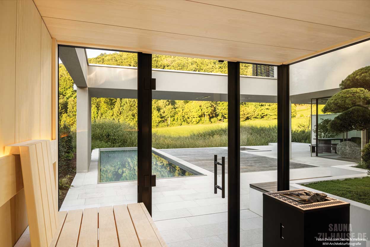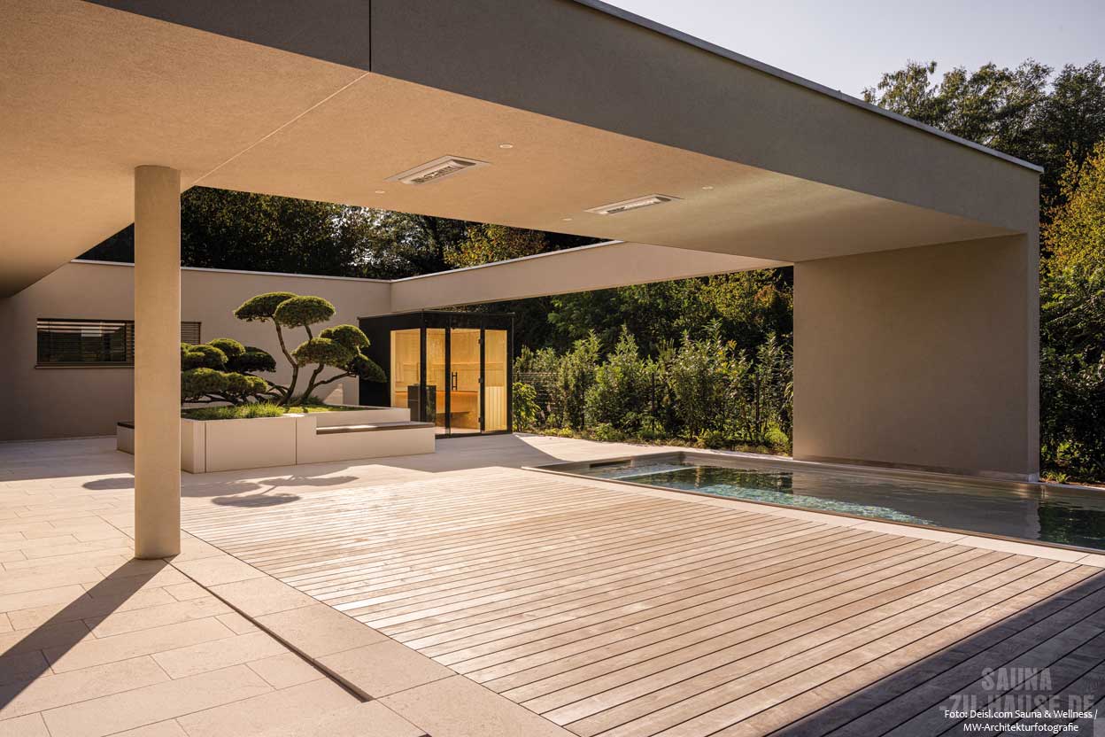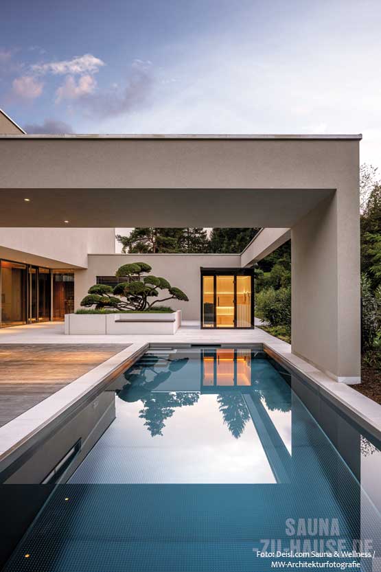 Momentan verlagert sich Wellness nach Hause. Viele Menschen investieren in ihre Gesundheit – und das im Eigenheim, geschützt und abseits vom stressigen Alltag. In diesem Kontext stellen Garten- und Outdoorsaunen eine praktische und wohltuende Erweiterung des Poolbereichs dar. So wünschten sich auch die Bauherren dieses Projekts eine maßgeschneiderte Sauna für ihr Private Spa. Hierbei sollte sich die Kabine unaufdringlich und harmonisch in das architektonische Gesamtkonzept einfügen, dennoch aber klare Akzente setzen.