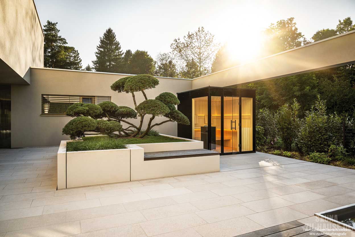 Ein Architektenhaus mit cleaner Formensprache, ein ebenso geradliniger Outdoor-Pool, eine Terrasse aus coolem Beton mit Holzelementen, als Kontrast ein großer Gartenbonsai – und ein puristischer Saunacube ganz in Schwarz, der das Herzstück dieses Wellnessbereichs unter freiem Himmel bildet. Im Inneren dieser Kabine sorgen sorgfältig gestaltete Details und hochwertige Materialien für das ganz persönliche Wohlfühlerlebnis.