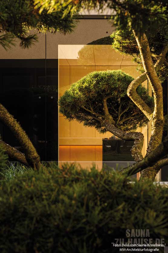 In enger Absprache mit den Bauherren entstand so eine einzigartige Designsauna, die zum Mittelpunkt im groß angelegten Garten und gleichzeitig zum Ausgangspunkt des Erholungsprogramms der Bauherren avanciert ist. Die gläserne Fassade des schwarzen Saunacubus erzeugt ein abwechslungsreiches Spiel aus Reflektionen und bildet einen spannenden Kontrast zu den übrigen Materialien der Terrasse. Sorgfältig gestaltete Details wie die Beleuchtung und hochwertige Materialien gewährleisten im Inneren ein Höchstmaß an Komfort und Ästhetik. Während der Fußboden für eine zuverlässige Isolation aus massivem Fichtenholz gefertigt wurde, präsentiert sich die komplette Innenausstattung inklusive der Decke und den Bänken in breiten Holzpanelen aus gemasertem, astfreiem Espenholz. So wird das minimalistische Design der Umgebung aufgegriffen und eine beruhigende Atmosphäre erzeugt. Besonders stimmungsvoll wird es in den Abendstunden, wenn die indirekte Saunabeleuchtung einen warmen Kontrast zur eher kühleren Außenhülle der Kabine setzt.