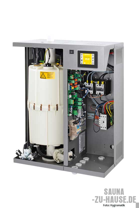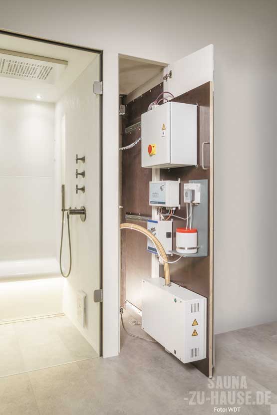 Übrigens: Die Wahl der Leistung des Dampferzeugers hängt von der Raumgröße und der gewünschten Dampfdichte ab. Für den privaten Gebrauch kommen meist elektrisch betriebene Dampfgeneratoren zum Einsatz, die in zwei Varianten erhältlich sind. Die erste Variante sind Elektroden-Dampferzeuger, die die Leitfähigkeit des Wassers nutzen. Dabei fließt Strom zwischen Elektroden, wodurch das Wasser erhitzt und Dampf erzeugt wird. Diese Geräte sind kompakt und wirtschaftlich, reagieren jedoch empfindlich auf die Wasserqualität. Die zweite Variante sind Dampferzeuger mit Widerstandsheizern, die nach dem Tauchsiederprinzip arbeiten. Hierbei erhitzen elektrische Widerstände das Wasser, um es zu verdampfen. Diese Geräte sind robuster und unabhängig von der Wasserqualität, allerdings größer und teurer.