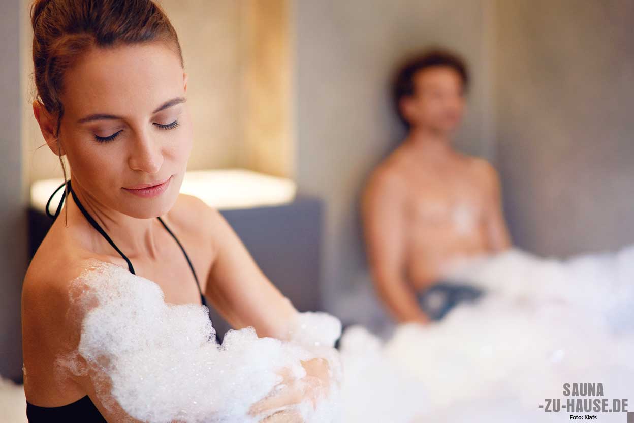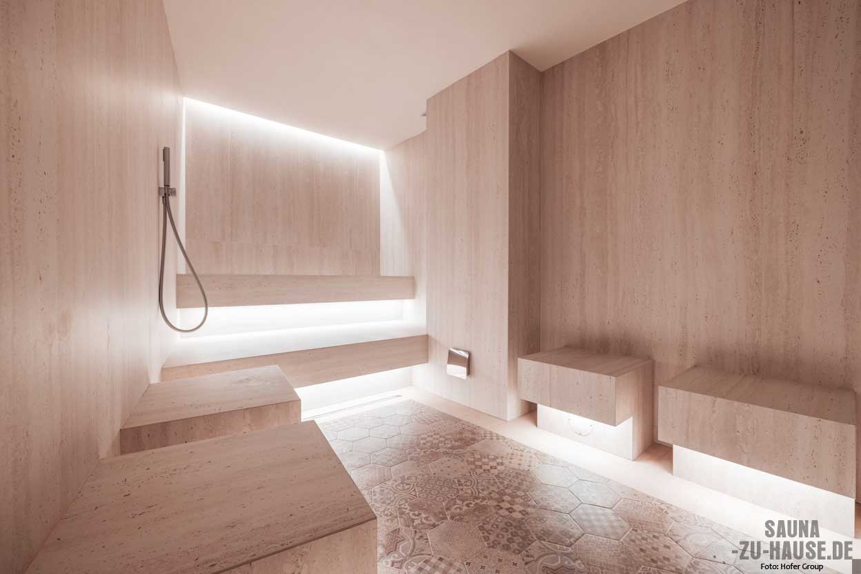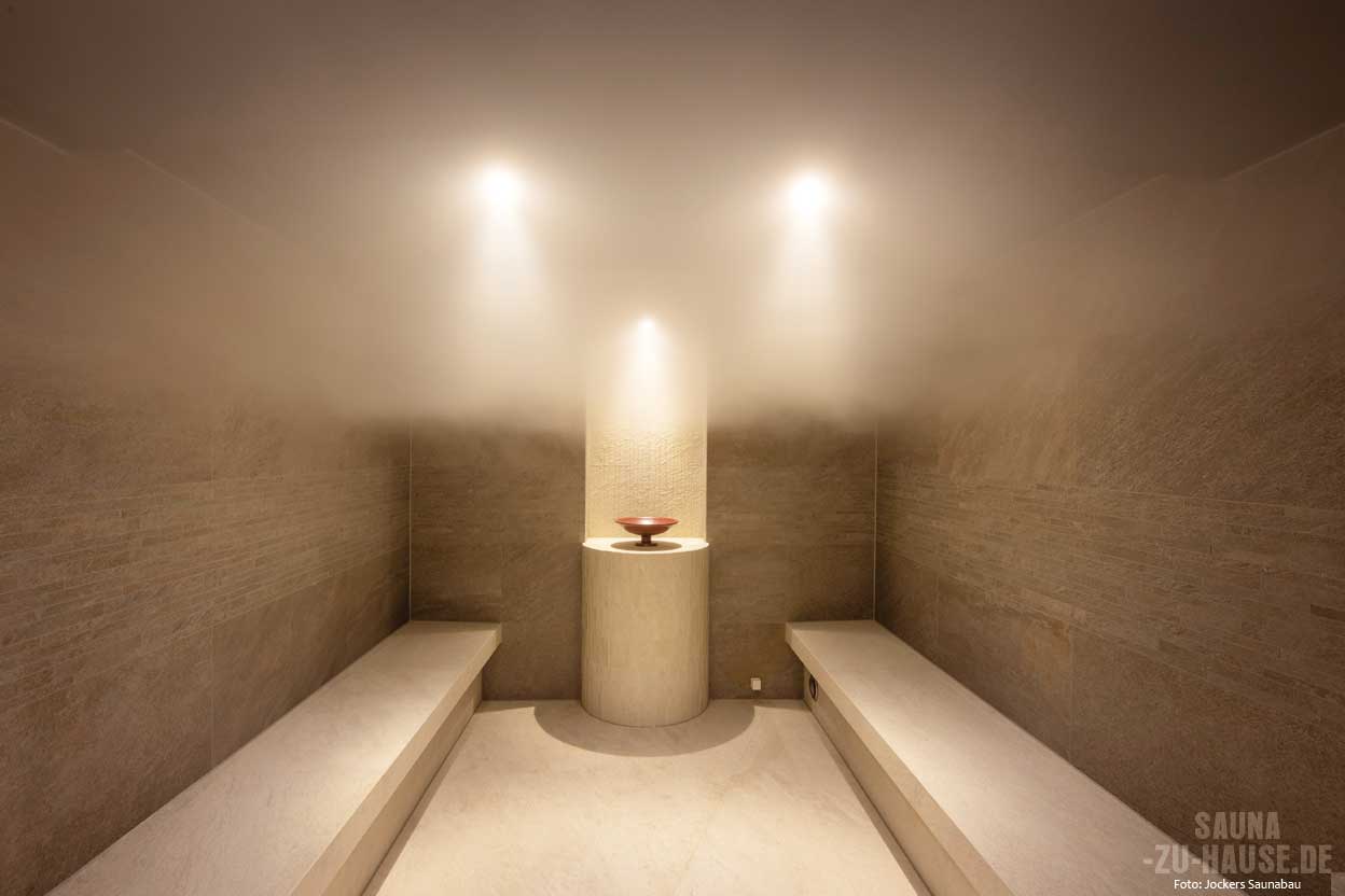 Duftstoffe oder ätherische Öle, die dem Dampf zugesetzt werden, schaffen zusätzlich eine angenehme Atmosphäre und unterstützen die positive Wirkung auf die Atemwege. Und auch die Beleuchtung im Dampfbad trägt entscheidend zur Atmosphäre bei. Dabei sollte die Grundbeleuchtung aus spritzwassergeschützten Einbauleuchten bestehen, die speziell für Feuchträume geeignet sind. Effektbeleuchtungen wie LED-Lichtbänder oder ein Sternenhimmel aus Lichtfasern können zusätzliche