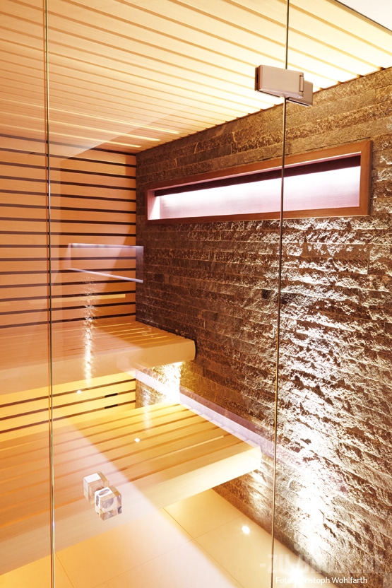 Um dem Ambiente Natürlichkeit zu verleihen, wurden gebrochener Stein aus der Region und naturbelassenes Abachiholz verwendet. Die puristische Transparenz schufen die Saunaprofis mithilfe von Glas und einem fließenden Übergang der Außenwand zur Saunainnenwand. Das lässt zugleich die beleuchteten Regaleinbauten besonders harmonisch wirken. Last but not least machen die schwebend wirkenden Saunabänke die Symbiose aus Natürlichkeit und puristischer Transparenz perfekt.