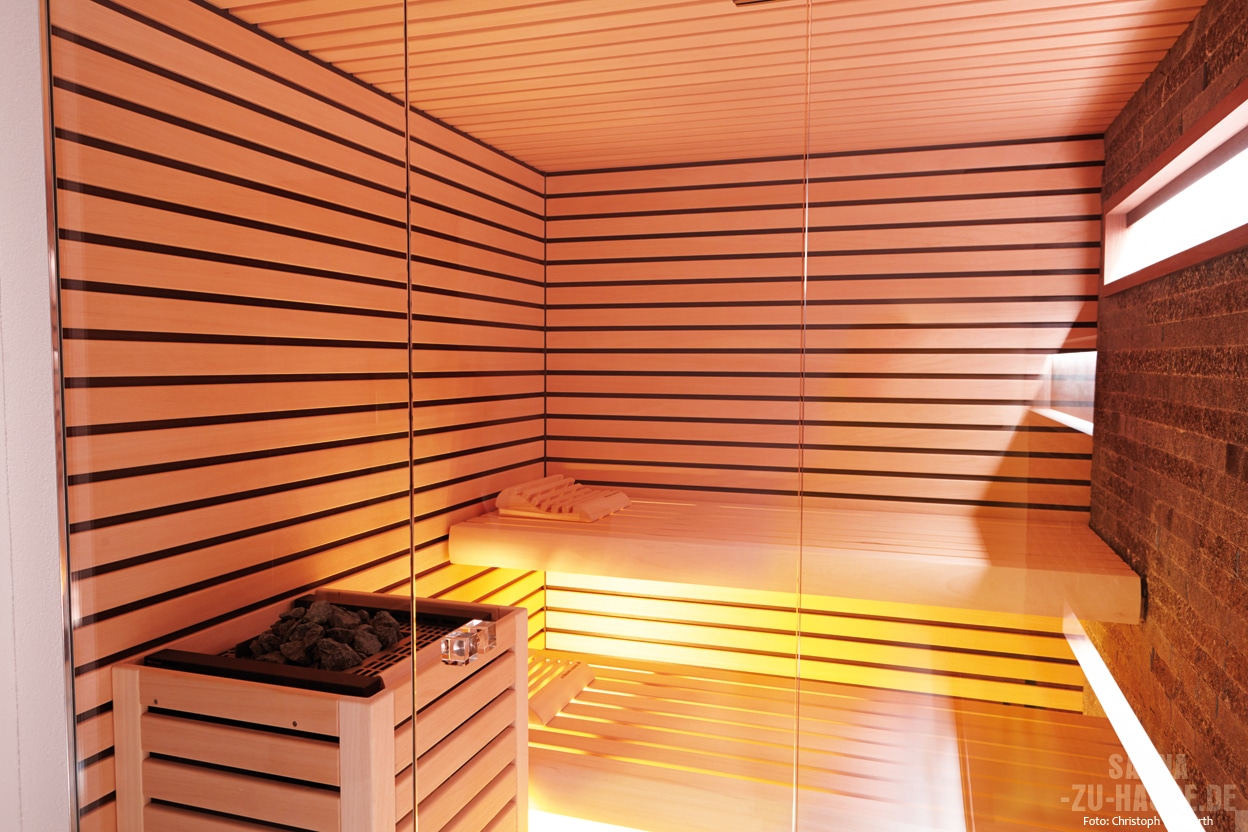 „Unseren Bauherrn war es besonders wichtig, den modernen puristischen Neubau des Hauses auch im Wellnessbereich erkennen zu lassen. Klares transparentes Design bestimmt den lichtdurchfluteten Wohnbereich. Diese Inspiration weckte den Wunsch, auch in der Sauna Transparenz mit einzubringen“, erinnert sich der Holzbildhauer und Saunadesigner Bernd Erdmann.