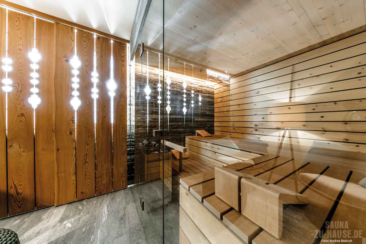 Verbindendes Gestaltungselement ist die stringente gerade Linienführung: Sowohl im Inneren der Kabine bei Vertäfelung, Bänken und Kabinenwand aus Valserquarzit wie auch im gesamten Raum fällt das moderne Design ins Auge. Wichtig war es, dass die verwendeten Hölzer naturbelassen, optisch hochwertig und regional sind. Toller Pluspunkt: Das spezielle Arvenholzenthält ätherische Öle, die in Kombination mit der Wärme im Inneren der Sauna antiseptisch wirken und obendrein noch sinnlich duften.