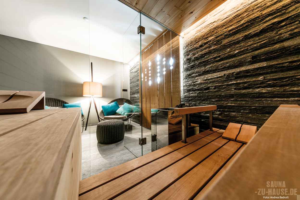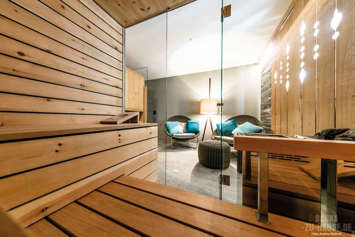 Familienhauses in den Schweizer Alpen. Das Leben oben in den Bergen ist entschleunigt und bietet Zeit für ausgiebige Wanderungen, Mountain-Bike-Fahren sowie Ski-Touren. Diese aktiven Hobbys von Magret und Peter Weinert schreien förmlich nach anschließender Entspannung. „Früher sind wir immer in den Spa-Bereich des nahegelegenen Hotels gegangen, um dort nach einem langen Tag an der frischen Luft die wohlige Wärme der Sauna zu nutzen“, erinnert sich Magret Weinert. Besonders im Winter war der Gang dorthin kalt und ungemütlich. Da kam dem Ehepaar die zündende Idee: Warum nicht einfach eine eigene Sauna ins Obergeschoss des Hauses bauen?