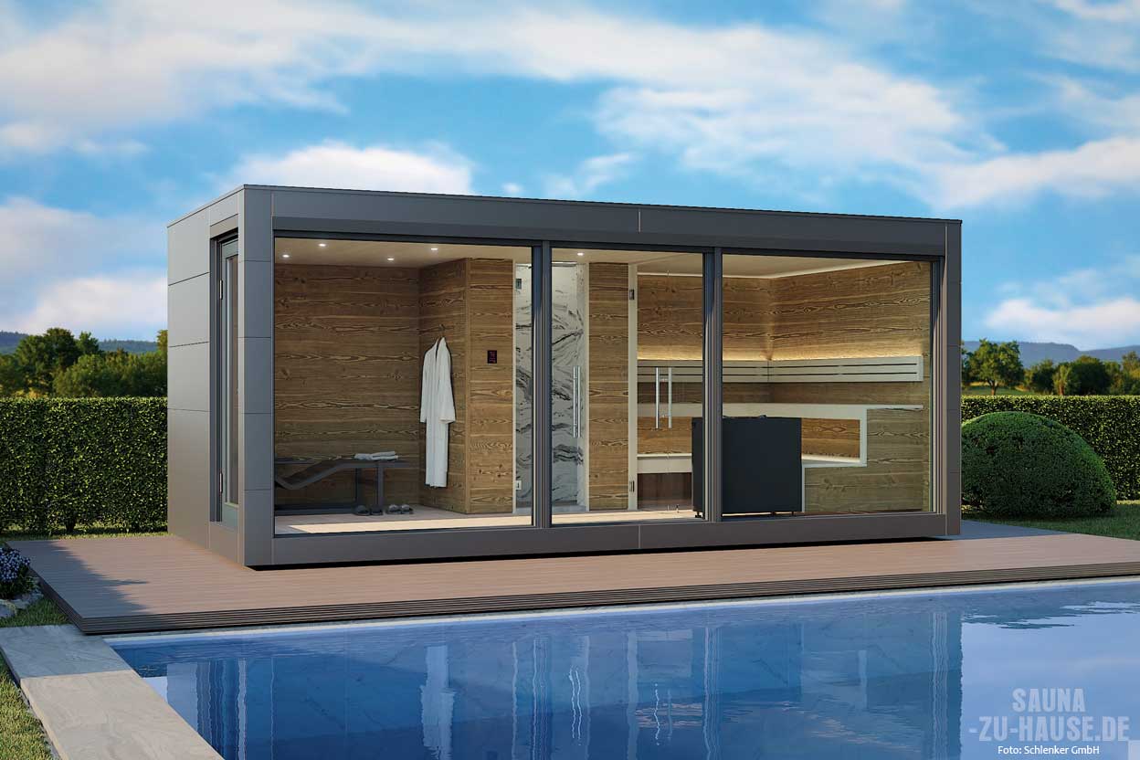Saunaraum, gibt es noch eine Duschkabine und einen durchdacht beleuchteten geräumigen Ruheraum. Ein besonderer Wohlfühlmoment wird durch die ganzseitige panoramahafte Aussicht garantiert. | www.schlenker-gmbh.com