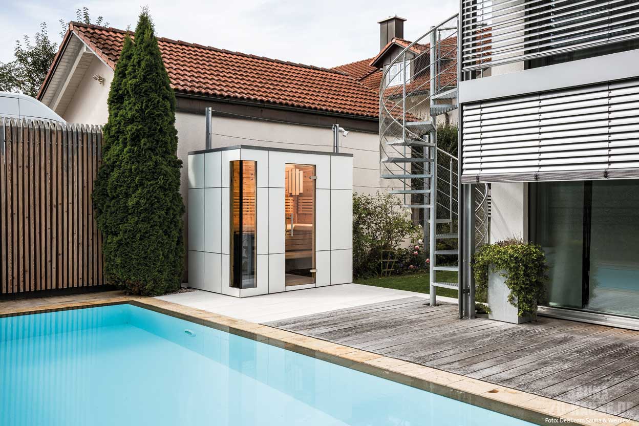 Trotz ihres bescheidenen Formats ermöglicht diese Sauna von Deisl ein luxuriöses und komfortables Wellness-Erlebnis, das sowohl Körper als auch Geist revitalisiert. Mit ihrem Platz sparenden Design und ihrer Energieeffizienz sind sie die perfekte Wahl für alle, die Wert auf Entspannung und Erholung im eigenen Garten legen, ohne dabei auf Komfort und Luxus verzichten zu müssen. Auch die Außenverkleidung dieses kleinen Spa-Ortes ist, mit den weißen Platten, schlicht aber modern gehalten. | www.deisl.com