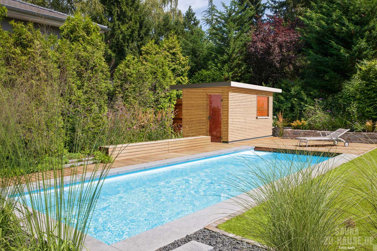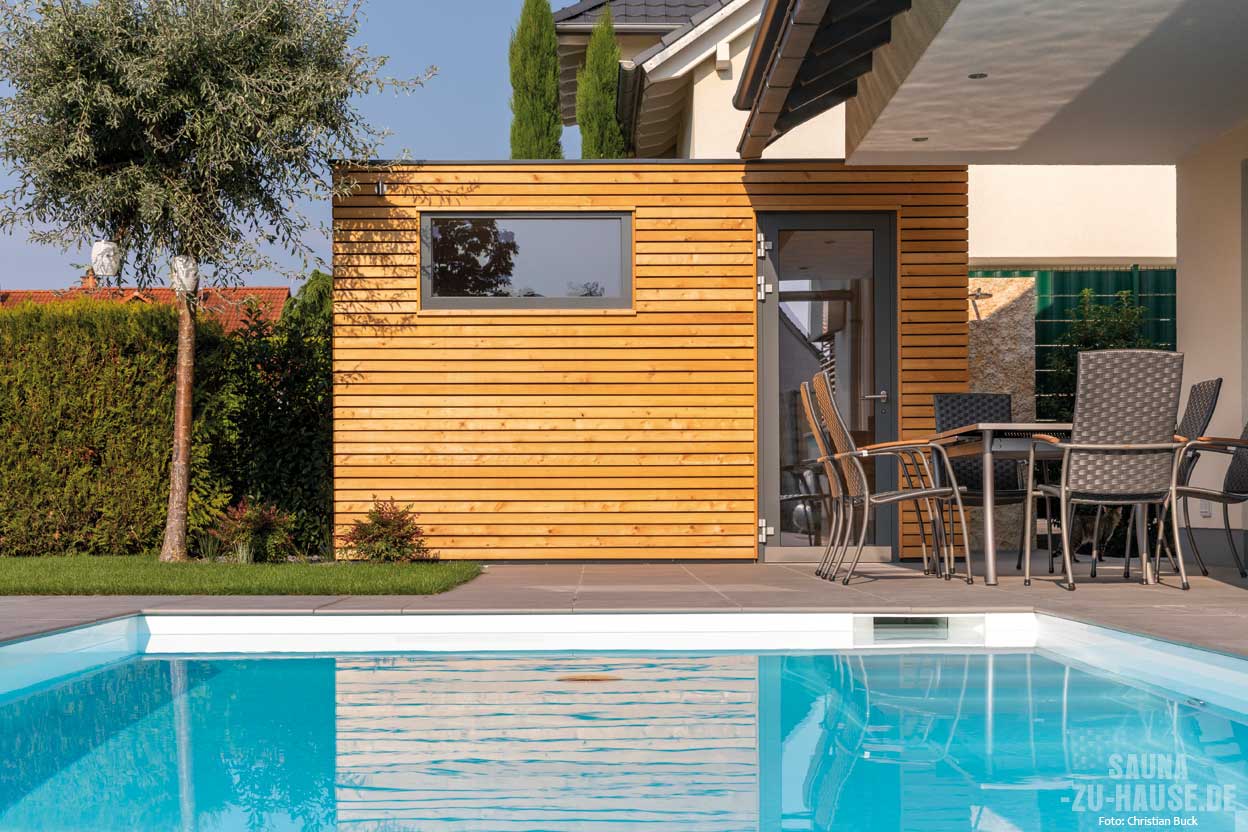 Erfüllen Sie sich Ihren persönlichen Wellnesstraum im eigenen Garten mit einer Außensauna. Gartensaunen können verschiedene Funktionen und Ausstattungen haben. Neben den Standardmodellen bietet Klaus Schlenker auch individuelle Saunaausführungen an. Diese hier ist voll ausgestattet. Neben