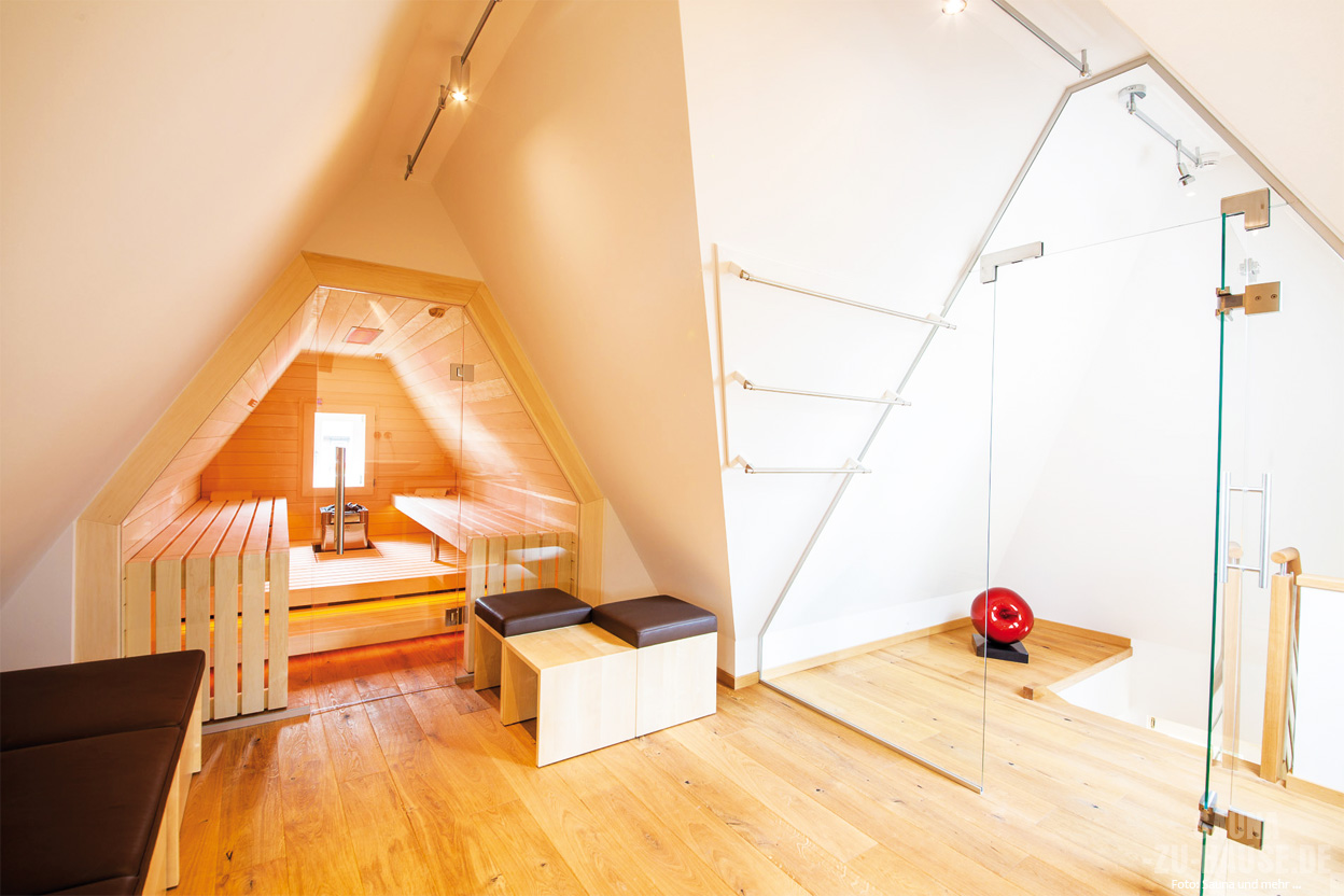 Eine weitläufige Altbauwohnung mit Blick auf das Elbufer: ein Traum mit Haken. „Die Dachschrägen der Wohnung haben mir zwar optisch gut gefallen, mir aber gleichzeitig schon von Anfang an Sorge bereitet“, erklärt Wellness-Fan Sabine Müller-Seitz ihr Dilemma. Denn der Platz schien ihr verschenkt, besonders im Bad. Bis sie ein Bekannter darauf ansprach, was eigentlich aus ihrem Traum von der eigenen Sauna geworden sei. Sabine Müller-Seitz dachte daraufhin wortwörtlich um die Ecke und ließ sich eine maßgeschneiderte Sauna in ihr Bad einbauen, die den Platz ideal ausnutzt.