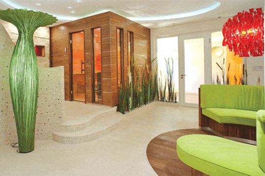 Inspirationsquelle waren moderne HotelSpas: „Der weitgereiste Bauherr wurde durch eine Vielzahl von Hotels und Lodges inspiriert und strebte eine vergleichsweise wohnliche, aber auch luxuriöse Atmosphäre an.“ Gelungen ist das dank der Abkehr von üblichen Bädermaterialien, hin zu edlen Holzfurnieren und modernen Composite Materialien. Ebenso unterstützen ausgewählte Pflanzen und Farben die Wohnlichkeit. Aber nicht bloßes Design beeindruckt, auch innovative Technik: „Alle elektrischen Einrichtungen lassen sich via EIB (Europäischer Installationsbus) per Touchpanel sowie iPad oder iPhone bequem steuern. So auch die Lichtdecke, die mit Swarovski-Kristallen und Lichtbändern gemeinsam mit den übrigen Leuchten eine wunderbare Stimmungen zaubern kann.“ Bei aller technischen Raffinesse wurden bewusst ökologische und ökonomische Varianten für den Betrieb herangezogen. Dazu zählen der Einsatz von Erdwärme (vier Sonden à 84 Meter Tiefe), Wärmerückgewinnung, LED-Technik und Vollwärmeschutz.
