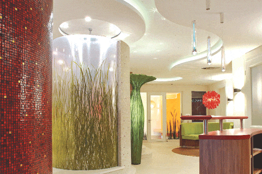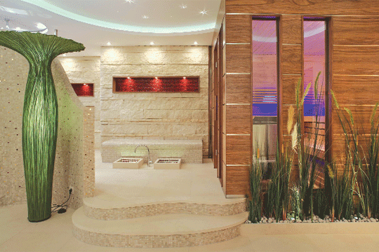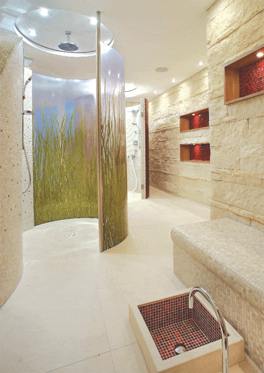 „Die Materialien wurden bewusst wohnlich ausgelegt. Nussbaumholz für die Sauna, Marmor für den Boden, Glasmosaike und Naturmaterialien an den Duschronden, Nussbaumparkett, gepolstertes Sitzrund, lackierte Möbel, stimmungsvolle Lichtquellen tragen zur Wohlfühlatmosphäre bei“, erklärt der verantwortlich zeichnende Innenarchitekt Howard Nagel das Raumkonzept. Stylish und doch gemütlich, könnte man es zusammenfassen, nichts wirkt unterkühlt, Kitsch wird aber vermieden. Dazu tragen wohl die fließenden Formen in der Raumgestaltung bei: „Geschwungene For- men und Kurven sind das zentrale Gestal- tungsthema. Sowohl bei den Möbeleinbauten als auch an der Decke und den Böden finden sich so gut wie keine geraden Linien.“ So wurde auch der höher liegende Duschbereich mit den weiteren Bereichen des Home-Spas verbunden: Wellenförmige Stufen erschließen die Duschzone. „Das Grundkonzept zielt darauf ab, verschiedene spannende Zonen zu schaffen und diese in einem erlebnisreichen Gesamtraum zusammenzuführen. Die funktionierende Koexistenz von Offenheit und Geschlossenheit war sehr wichtig. Das Spa mit seinen vielfältigen Funktionsbereichen sollte differenziert erlebbar sein. Offene, halb offene und abgeschlossene Bereiche wurden entsprechend zueinander in Bezug gesetzt. Die Form- und Materialwahl bot dazu gute Möglichkeiten“, so der Innenarchitekt. Ein gutes Beispiel dafür ist der Duschbereich, der von halb transparenten Kunststoffelementen umschlossen ist – der Clou: In den Kunststoff wurde echtes Seegras eingegossen, ein raffinierter Einfall, um die Individualität der Anlage hervorzuheben. Die Idee wurde ein zweites Mal aufgegriffen, diesmal in Form von Seegras in einem Kiesbett, das entlang der Saunakabine und Teilen des Eingangs gezogen wurde.